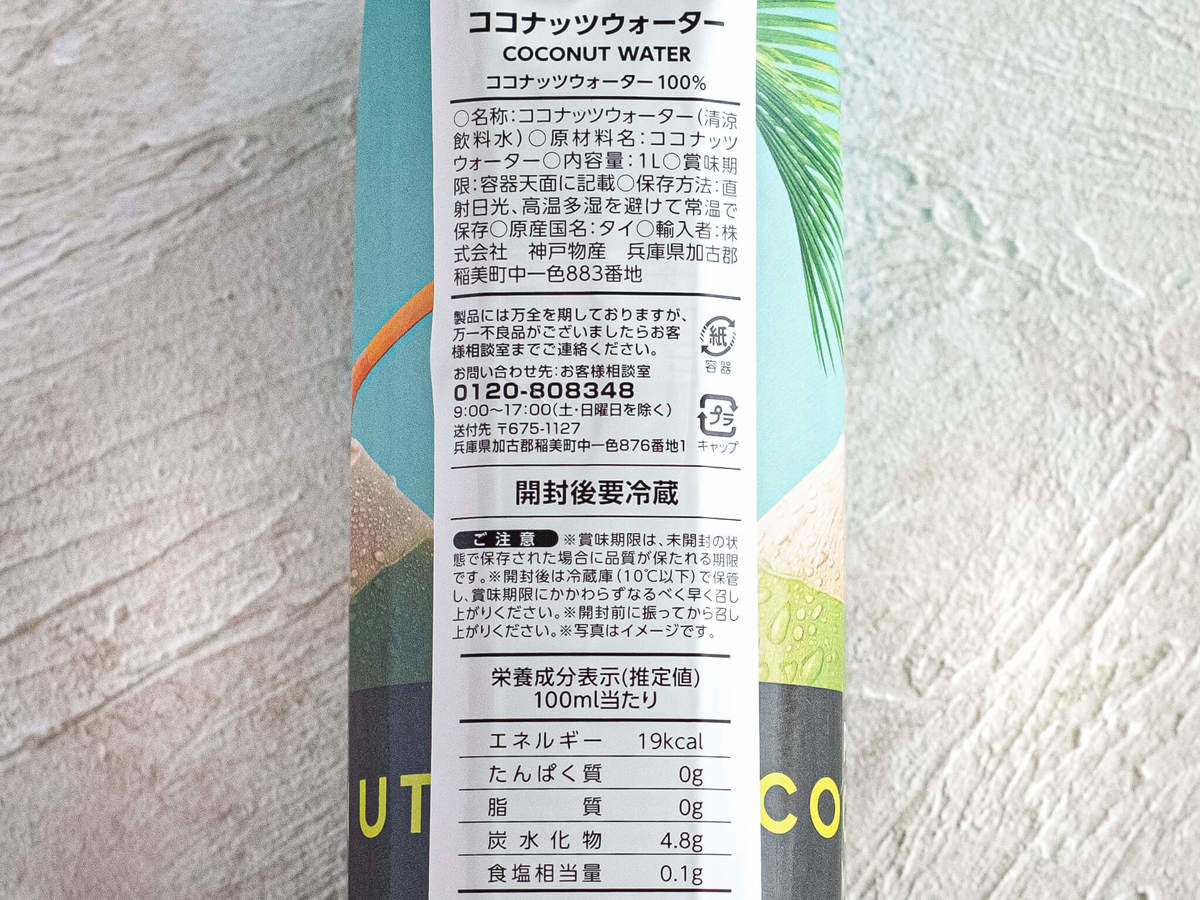 ココナッツウォーター100%でこの価格。コスパは良いといえるのではないでしょうか。