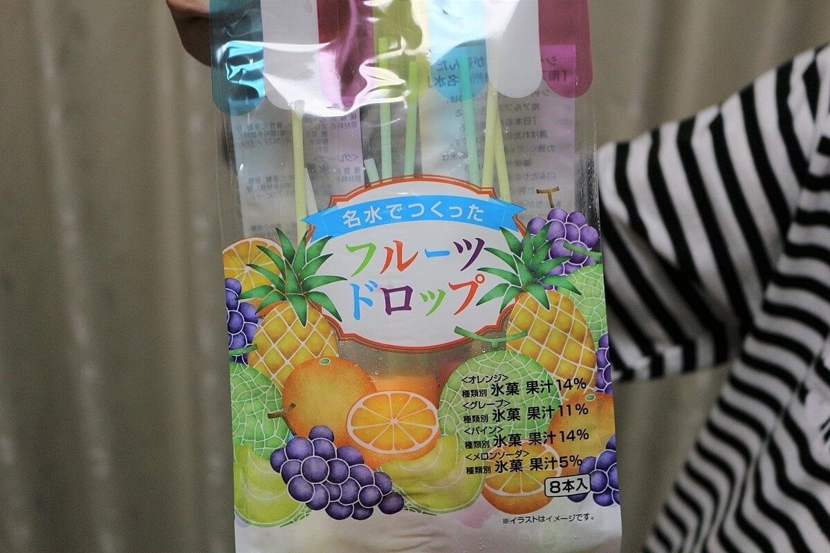 フルーツドロップアイスキャンディ「メロンソーダ」「グレープ」「オレンジ」「パイン」4種類×2本入っています。