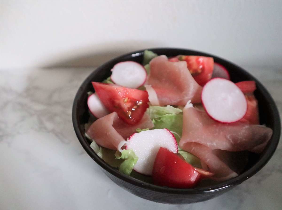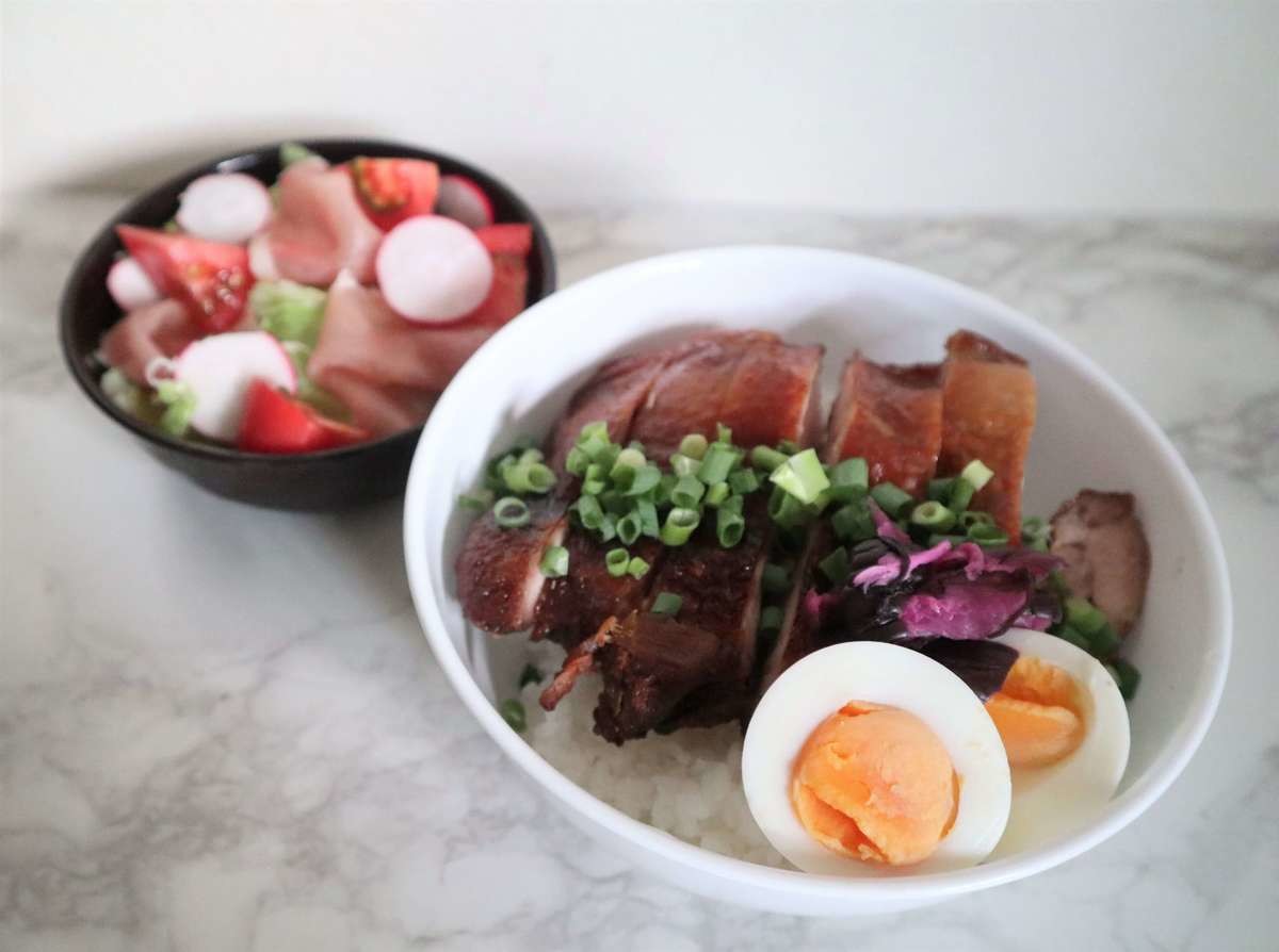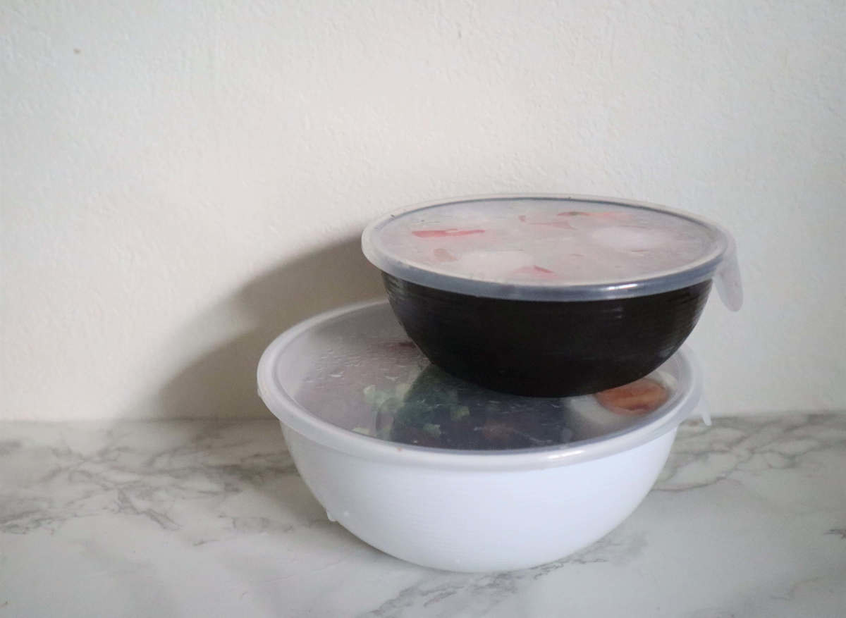 丼とサラダのセットをスタッキングして冷蔵庫に入れておけば家族が一目でわかります。