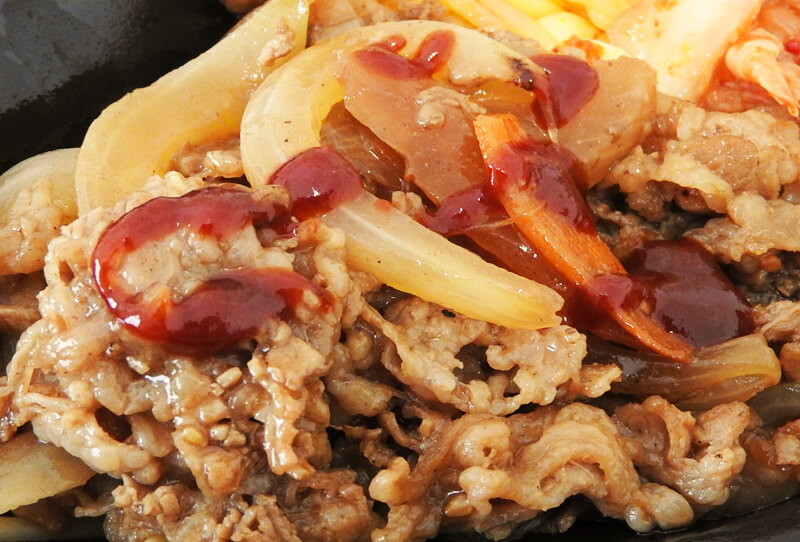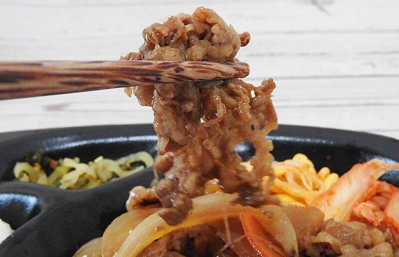 牛のバラ肉、玉葱、人参の野菜と炒めてタレを絡めたカルビ焼肉を白菜キムチ・豆もやしナムルと一緒に食べられる「カルビ焼肉」。タレにはリンゴ果汁を加えているとのことで、甘さが出ているようですね。