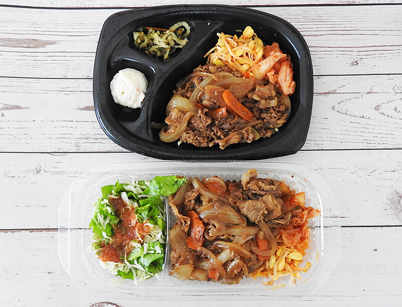 「カルビ焼肉おかずのみ」との比較は、写真の通り。写真で見るとわかりにくいですが、Wカルビ焼肉は少なくとも野菜は多く入ってそうですよね。