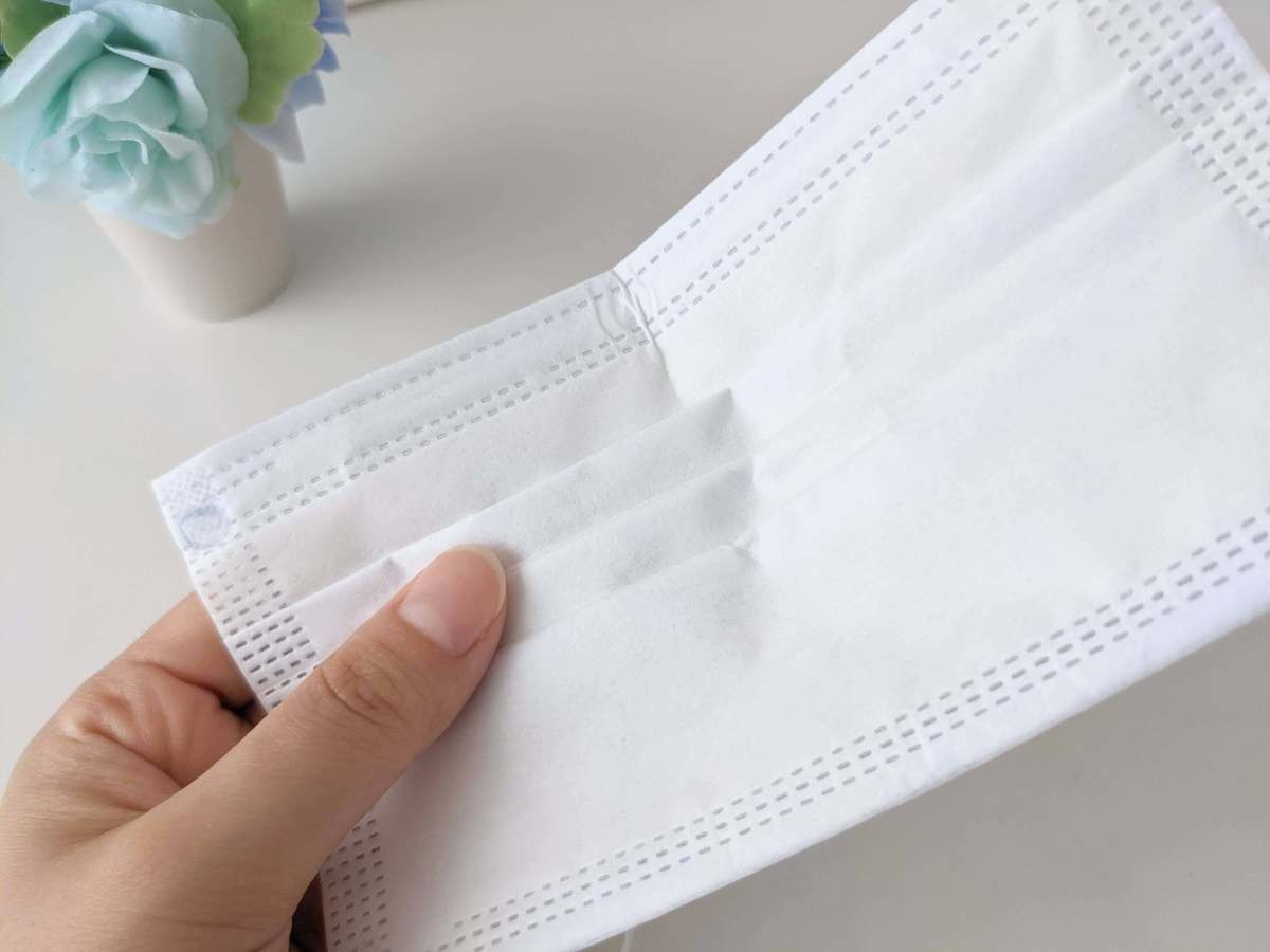 表側は普通の不織布マスクと同じ肌触りです。 血色マスクも良いですが、シャーベットカラーだと清潔感のある爽やかな印象に。