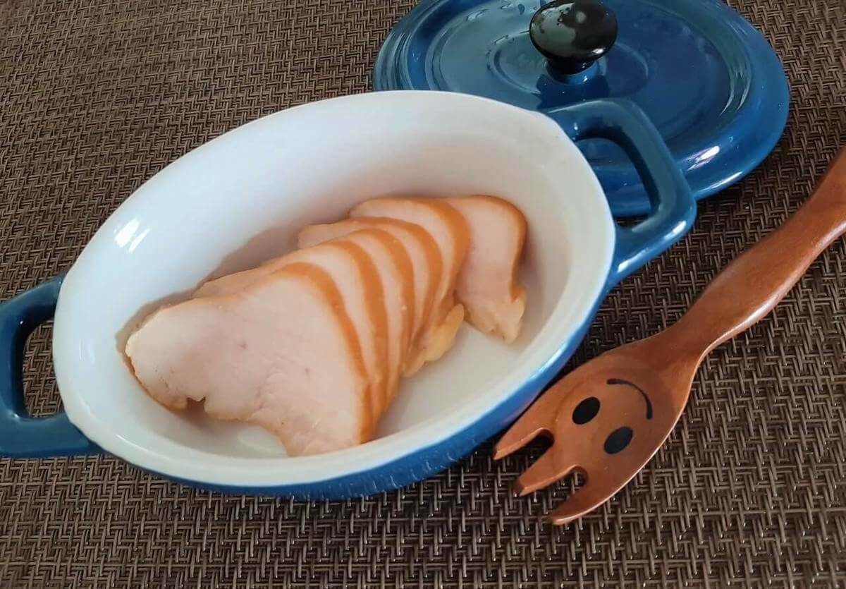 冷蔵庫から出してすぐに切ったのですが硬くなく、口の中でふんわり桜チップの香りが広がります。 そのまま食べてもしっかり塩味や鳥の旨味も感じられるので、味付けなしでOK!