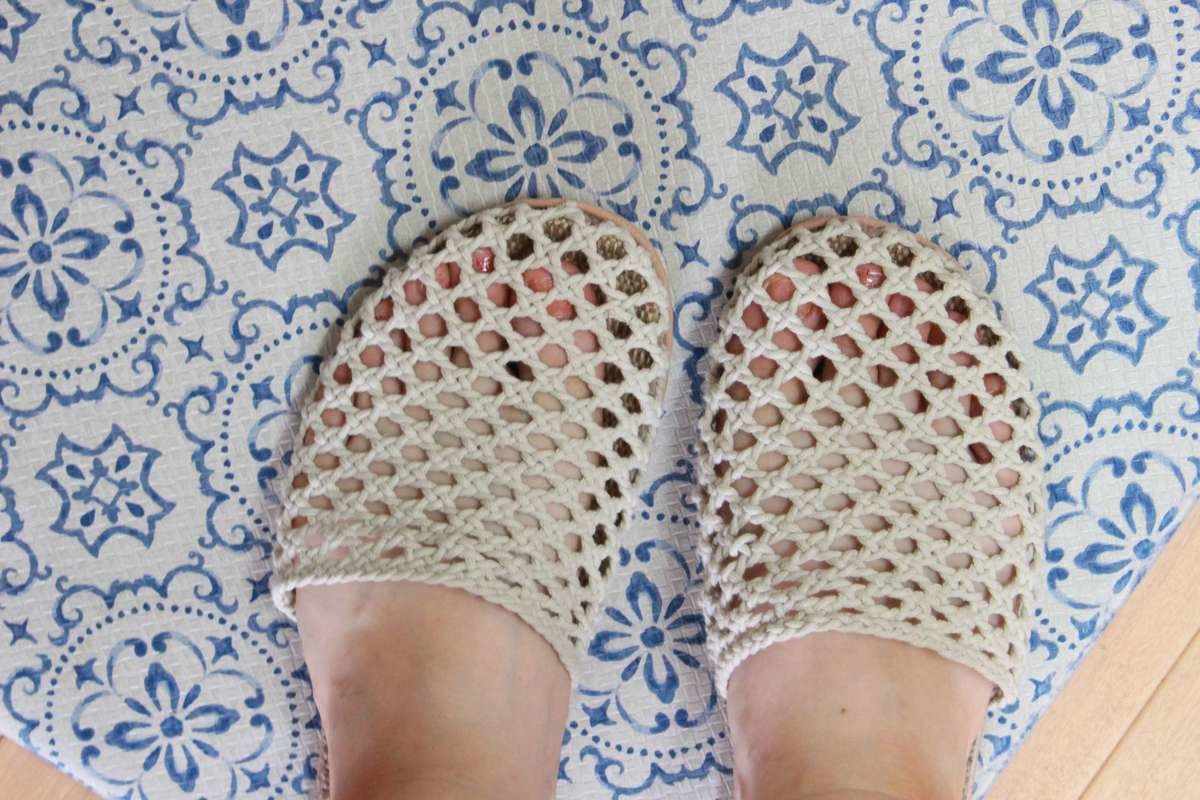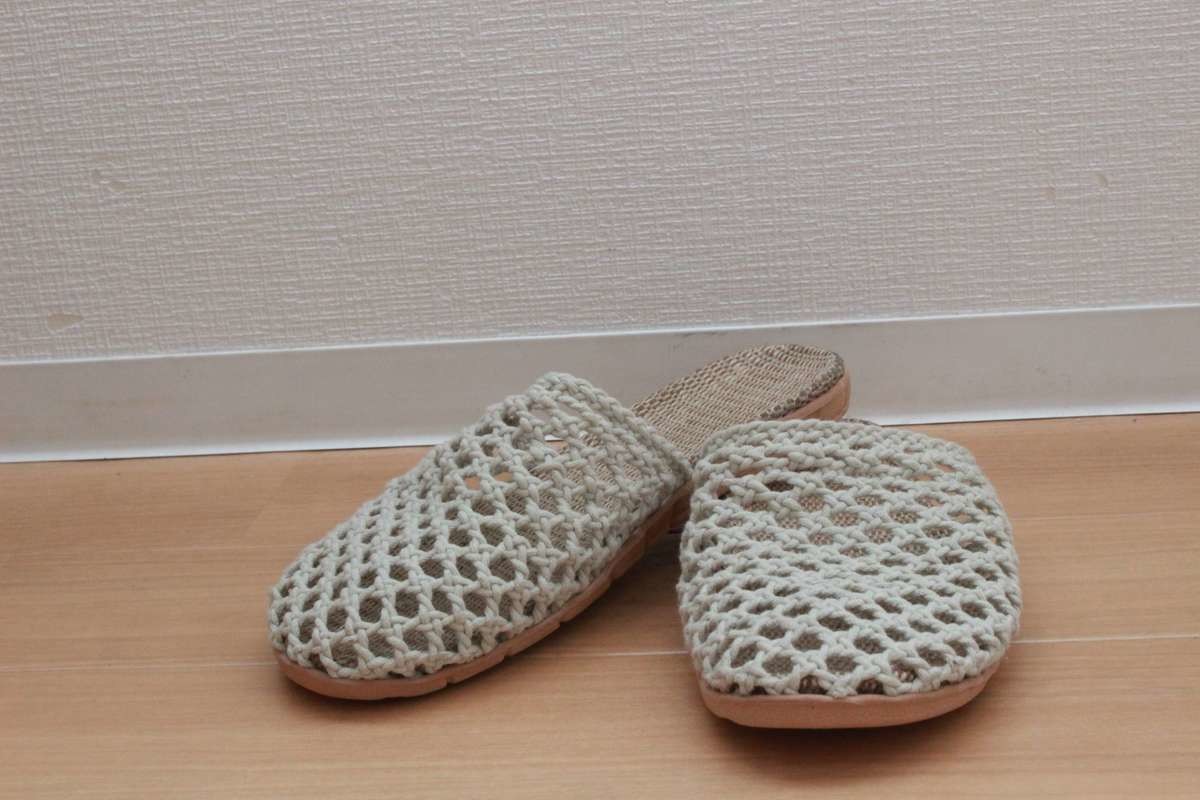 以前は、ビーチサンダルを履いていたのですが、夫から「ペタペタうるさい」と苦情がきてしまい、よくあるスリッパに買い替えました。