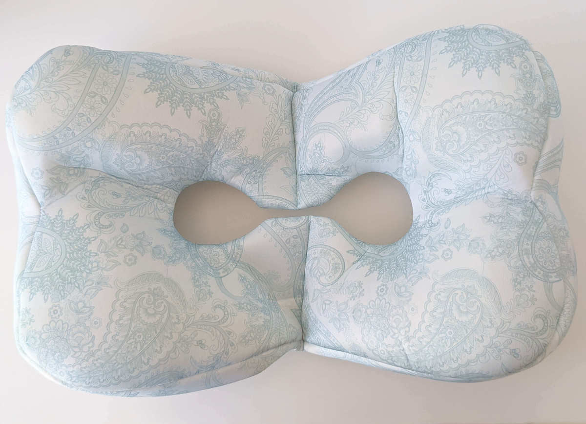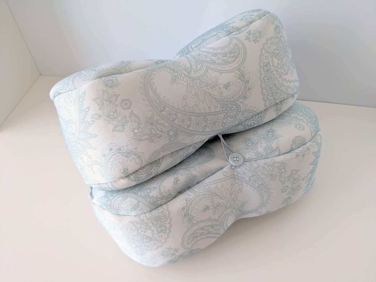 まくらとして使うときには、このように折りたたむことができます。 ボタンにゴムを引っ掛けて固定できるので使いやすいです。