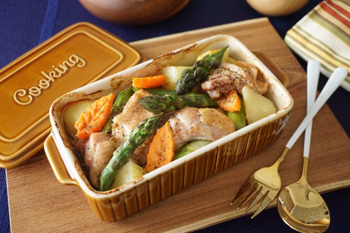 - 「蒸す」と「焼き」で柔らかチキンと野菜グリル