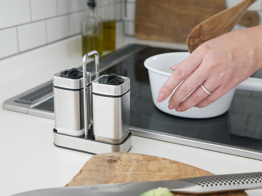 いつもは食卓に置いておき、お料理中はキッチン使いにしてももちろんOK。片手で持てるので扱いやすく、フタをくるっと回すだけなのでお料理中もスムーズに。