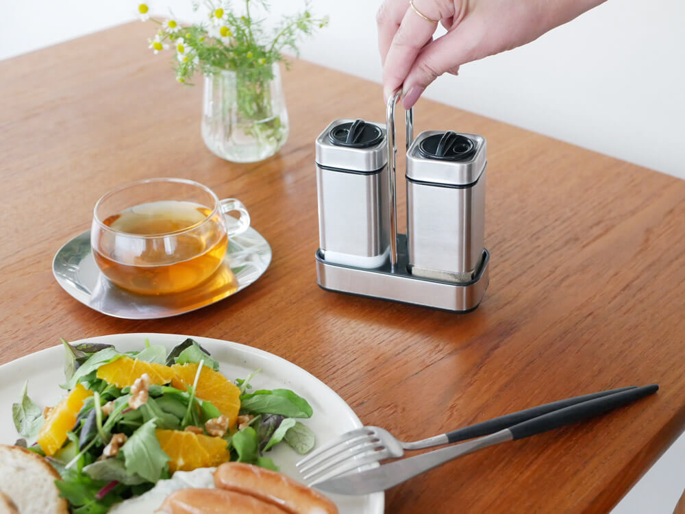量の調節もかんたんで、忙しい時間にも助かりますね。 塩・コショウ、だけでなく砂糖・数種類のスパイスなどセットで揃えたくなるシンプルなデザインもGOOD。