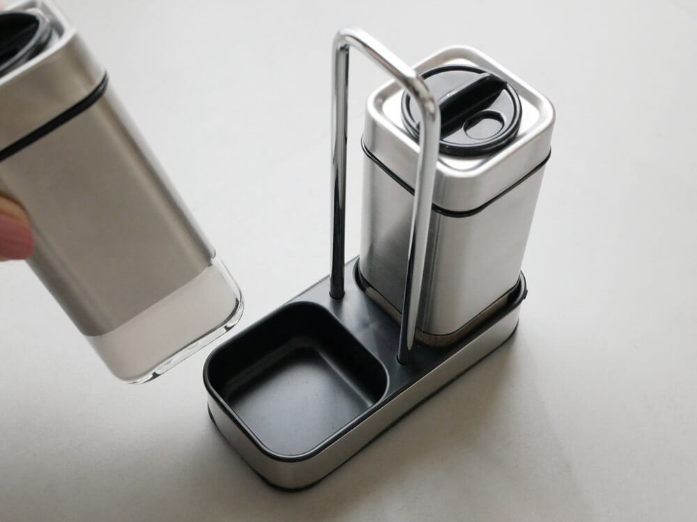 「スパイスジャー」のグッドポイントは、持ち運びもかんたんなところ。 スタンドに2個乗せたまま指先で移動できるので、キッチンや食卓と大活躍。