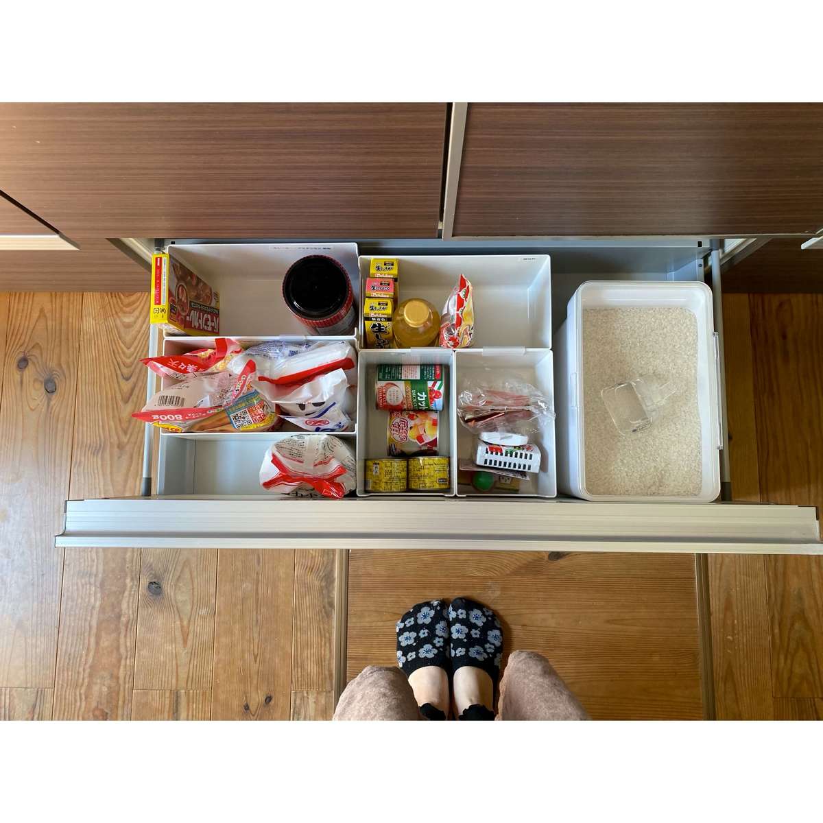 パントリーがないからこそ、食品のストックできる場所はどうしても限られてしまいます。 我が家は引き出しのひとつを食品ストック入れとしていて、そこに入るだけ…と決めています。
