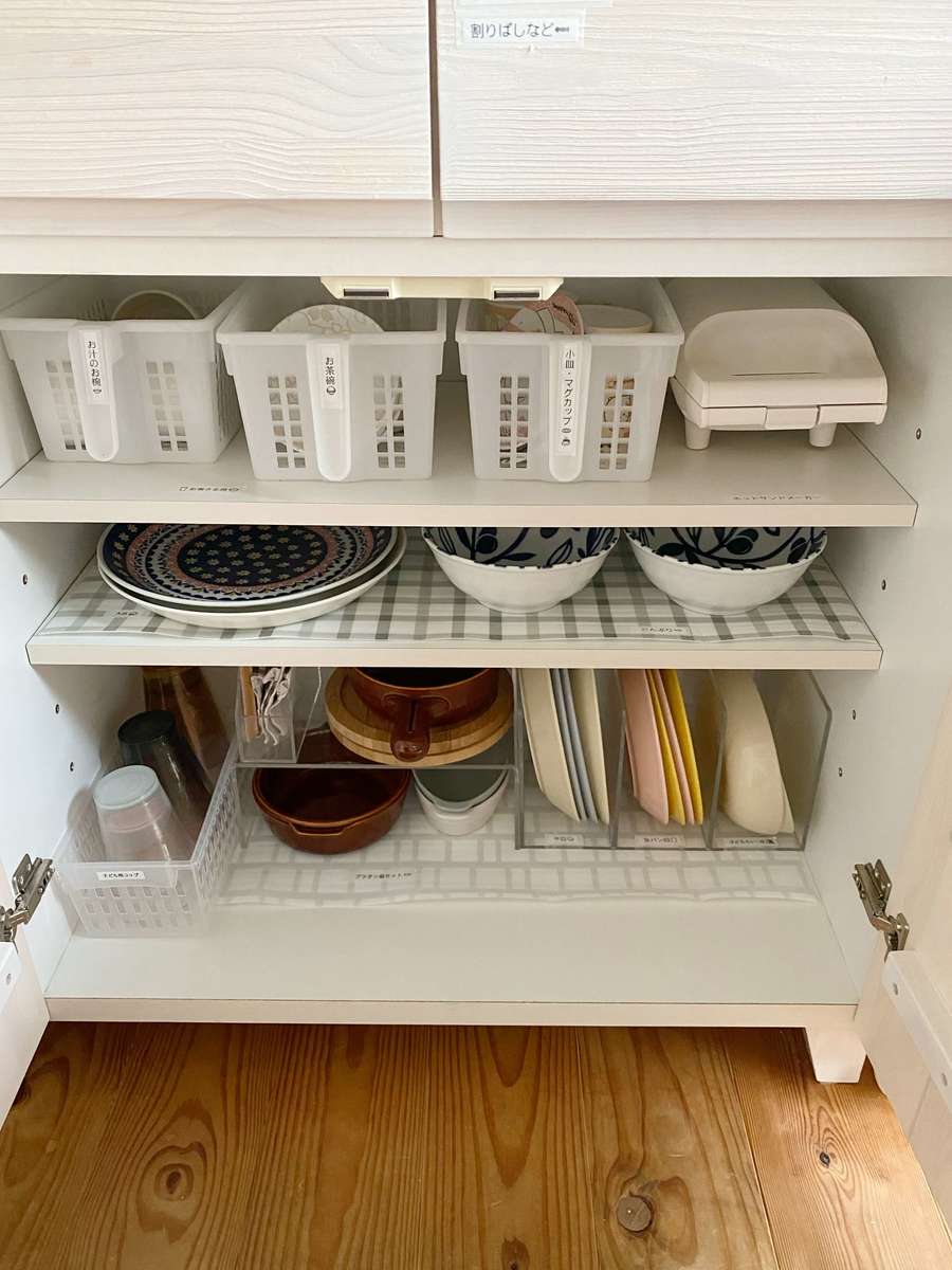 無印良品のアクリル仕切りスタンドを使って、お皿を立てる収納にして取り出しやすくしてみたり、コの字ラックで上部にできる空間を収納として使ったりすることで、デッドスペースを有効活用したりしています。