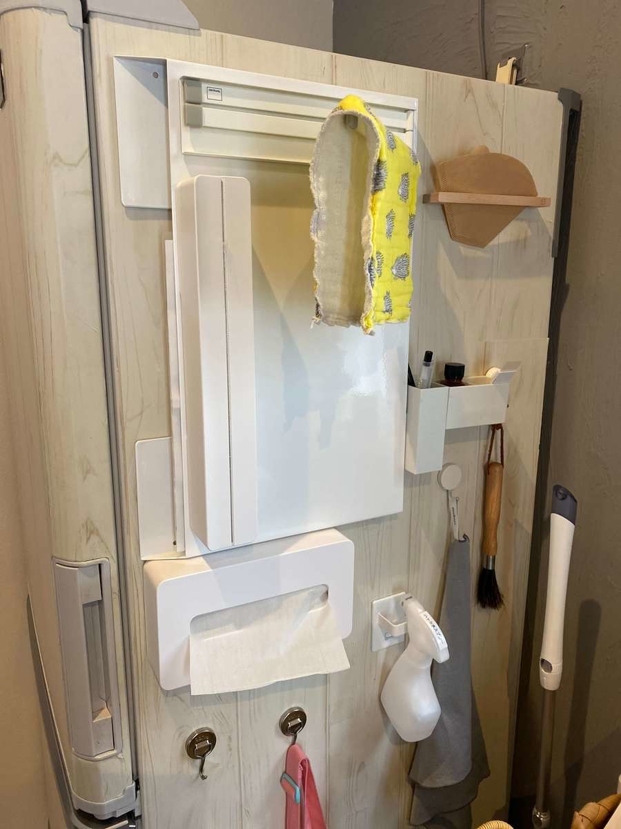 マグネットで引っ付くアイテムを上手く活用しながら冷蔵庫横にありとあらゆるものを収納しています。
