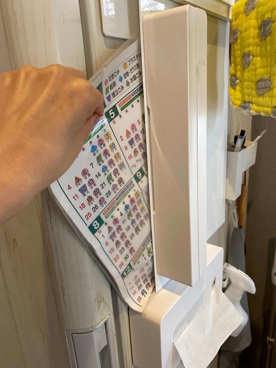 ゴミカレンダーはtowerの「ランチョンマット収納」アイテムに入れています。こちら表面にもマグネットが引っ付くのでとても便利です。