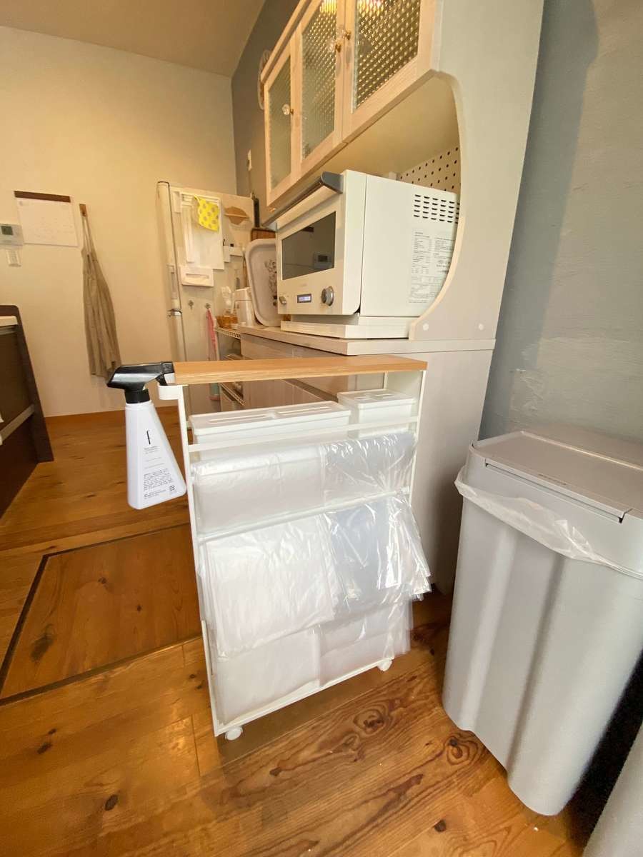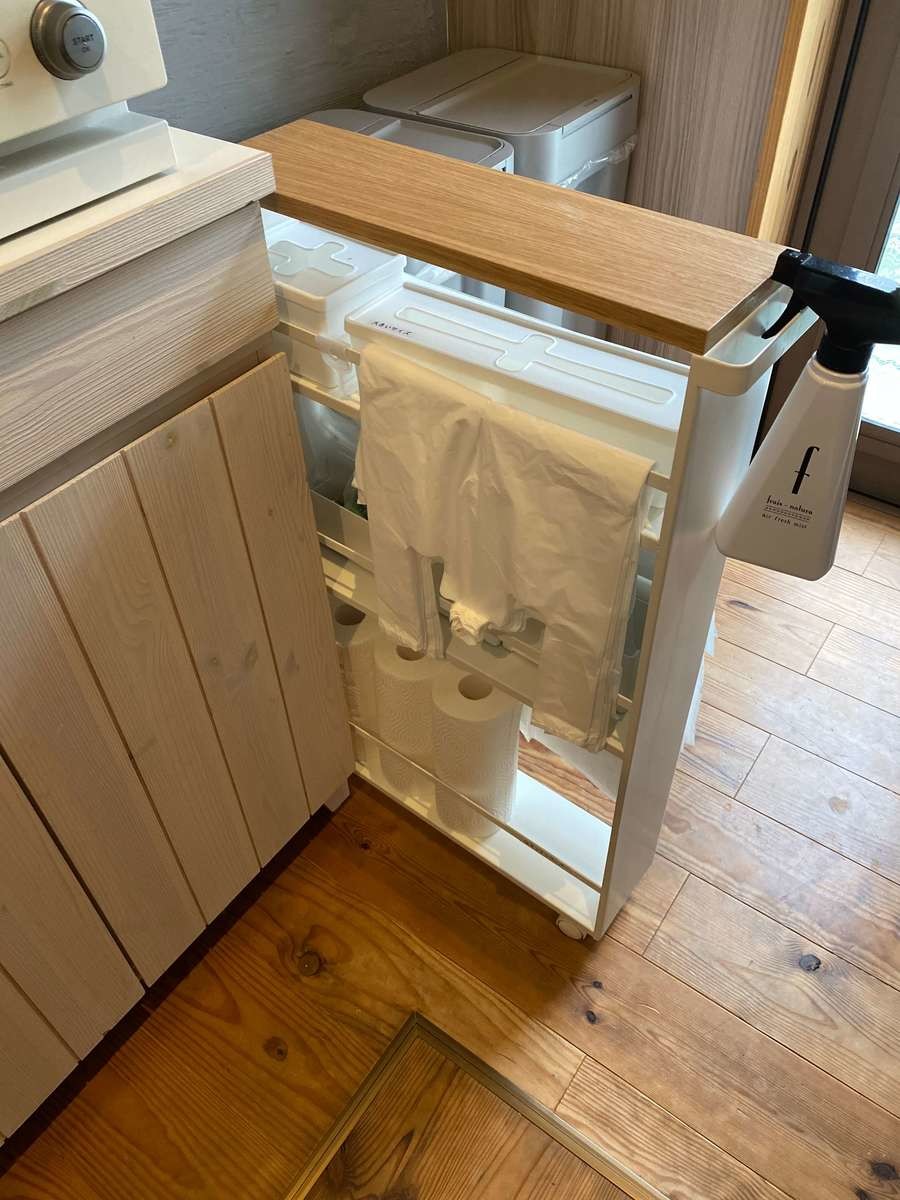 また、隙間ラックも活用して、ゴミ袋やキッチンペーパーなどを収納しています。