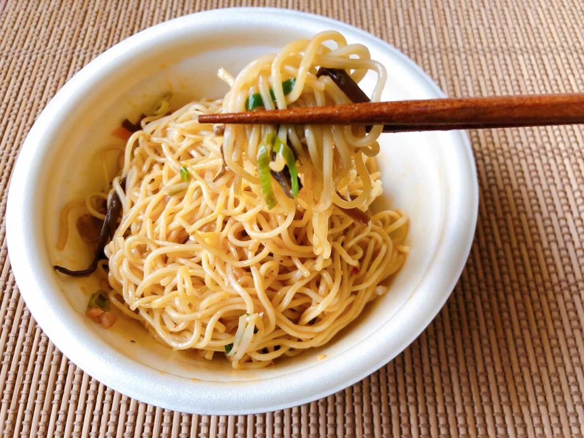 混ぜるたびにとんこつラーメンの香りがするのですが、スープがないのが不思議。どんな味が気になってしょうがないところで、いざ実食!