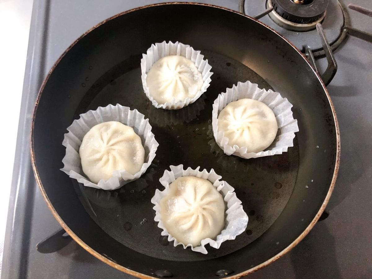 フライパンに200ccの水を入れて、紙カップごと小籠包を置き、フタをして温めるだけなのですが、実はここに嬉しい工夫があります。