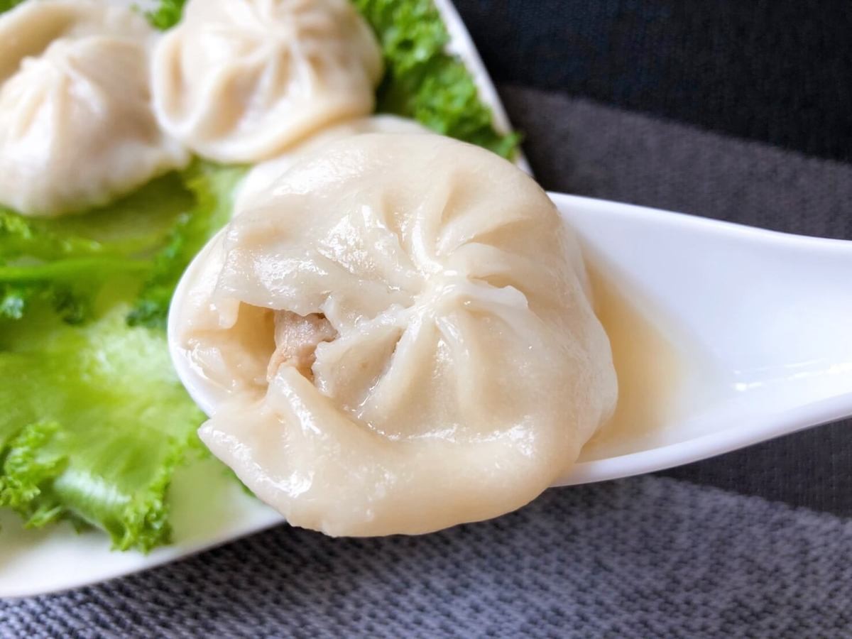 なんといってもスープがたまりません!レンゲの上で小籠包がスープに溺れています。