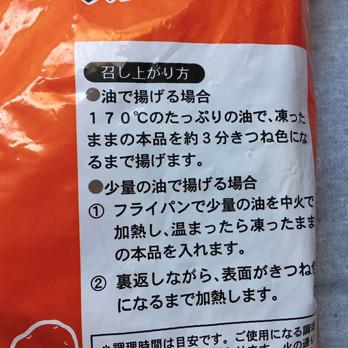 パッケージの裏面には、「170℃の油で凍ったまま3分ほど揚げる」と説明書きがありました。