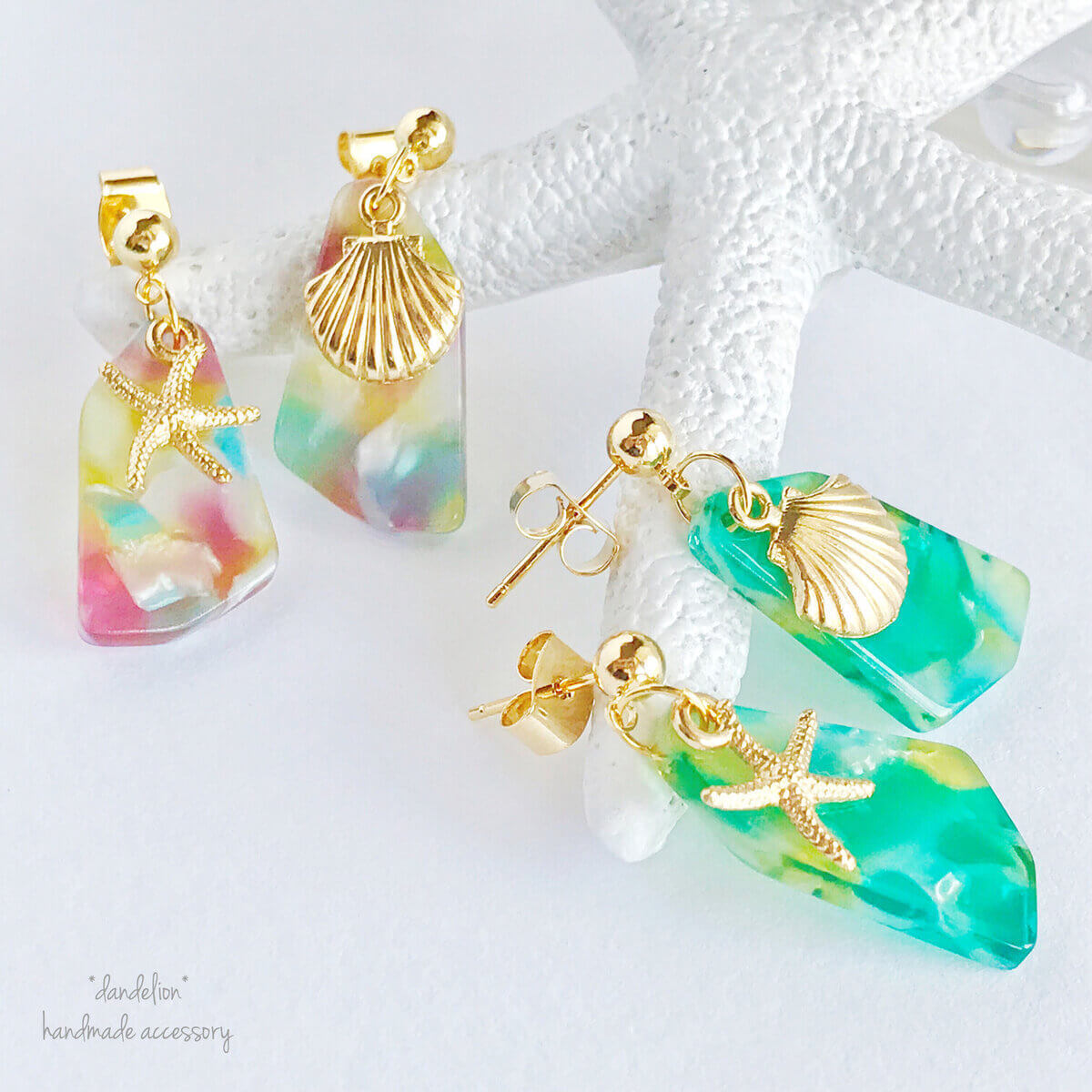 シーグラス風のマーブル多角形モチーフの大人かわいいピアスです。