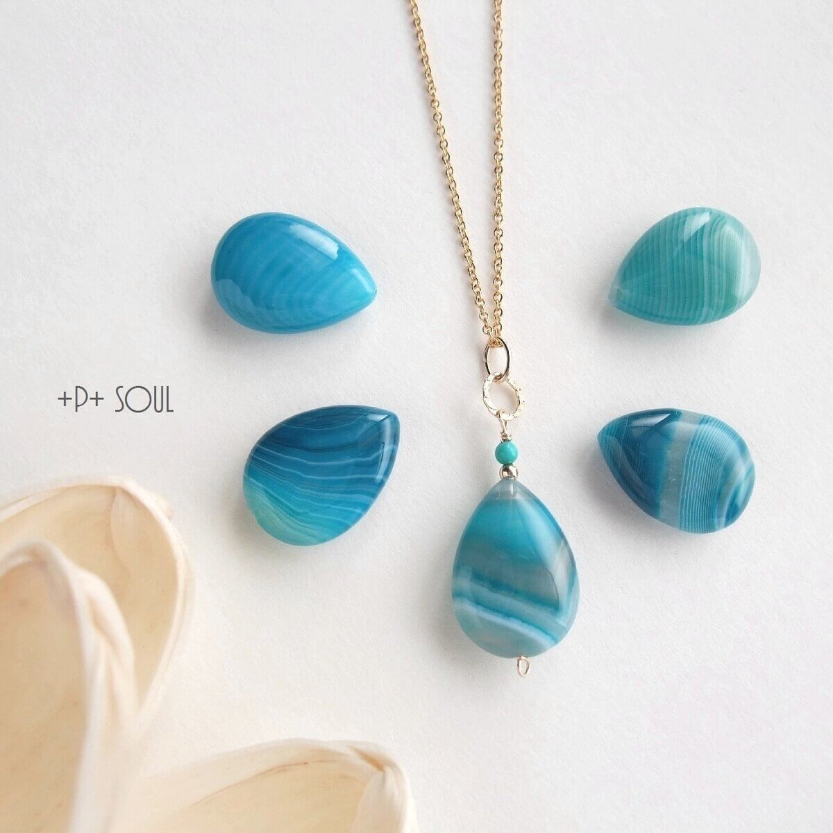 ブルーバンデッドアゲート(瑪瑙)のフラットドロップをあしらった天然石ネックレス。石の柄は一つずつ異なるので、デザインが同じでも全く違った表情に見えるのが特徴です。