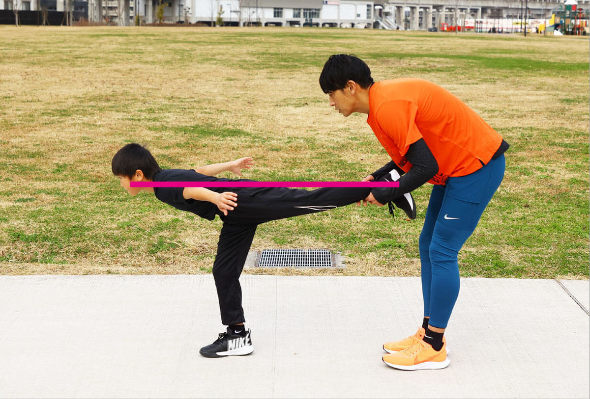 ポイントは2つ。ひとつは、頭から足まで一直線の姿勢を保ったまま、けんけんをすること。もうひとつは、けんけんをしているほうの足のひざが曲がりすぎたり、おしりが下がったりしないように注意すること。