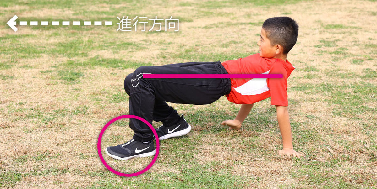 そこで紹介するのが「ムカデ歩き」です。背中側を下にした状態から腰を浮かせて、両腕と両足を支えにカラダを持ち上げます。その姿勢のまま、足の方向に一歩ずつ前進します。