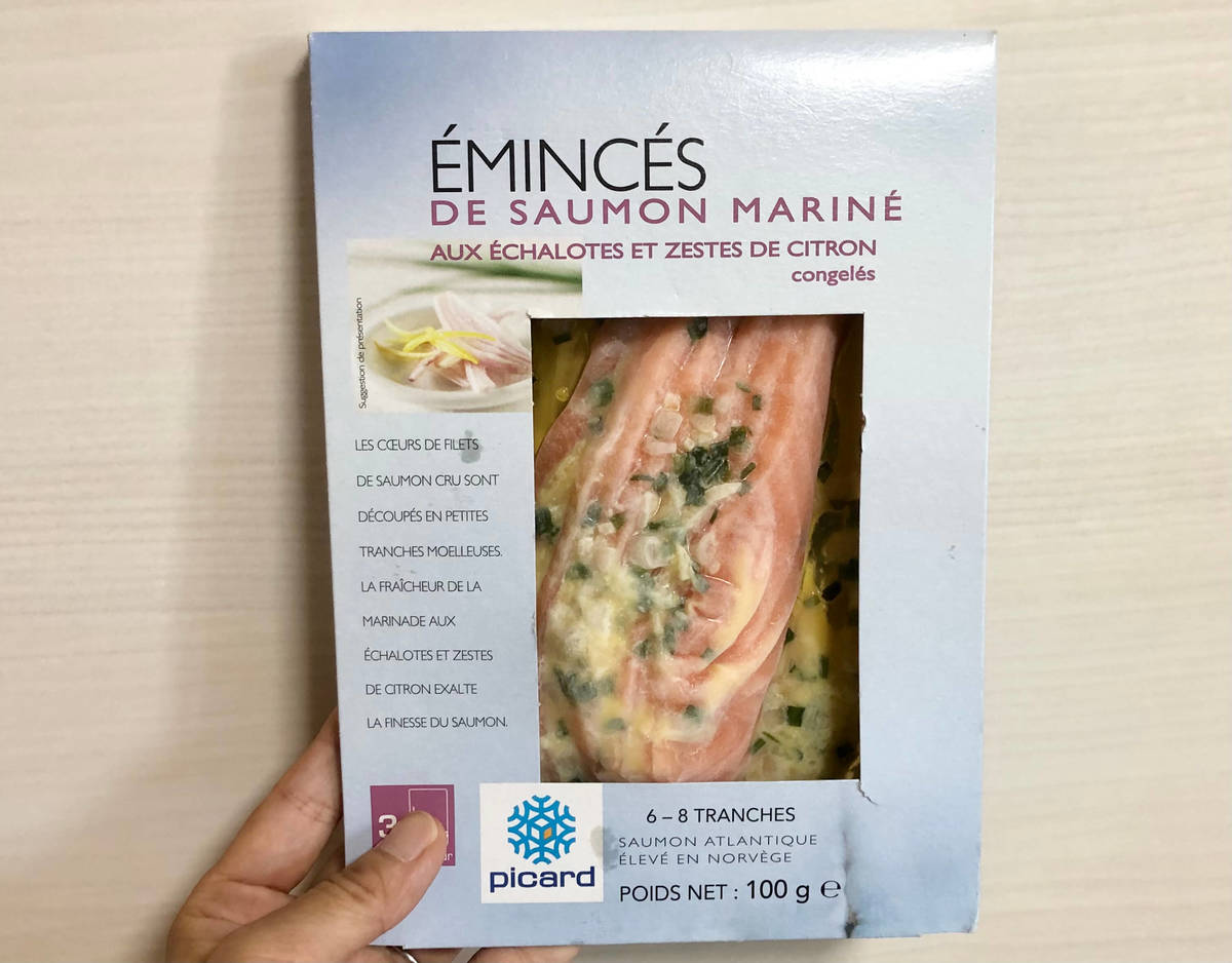 ピカールはおしゃれなマリネもたくさんあります。ピカールの前菜は、食卓が一気に華やかになるものが多いんです。このマリネは、1切れ1切れが長いのが特徴です。