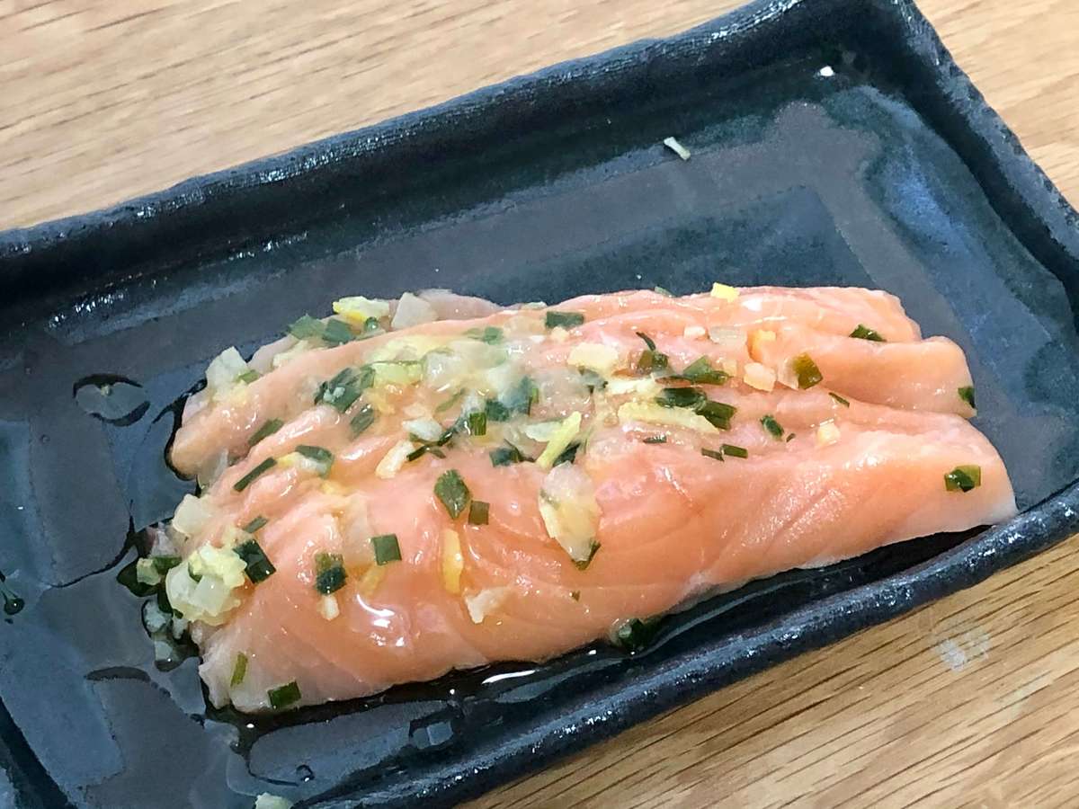 アトランティックサーモンに、エシャロットレモンピールがかかっていています。オイルがしっかり沁みているのでレタスやサラダ菜と一緒に食べてもおいしいですよ。塩分控えめで作られているので、ほんの少しだけ、醤油をかけてもおすすめす。