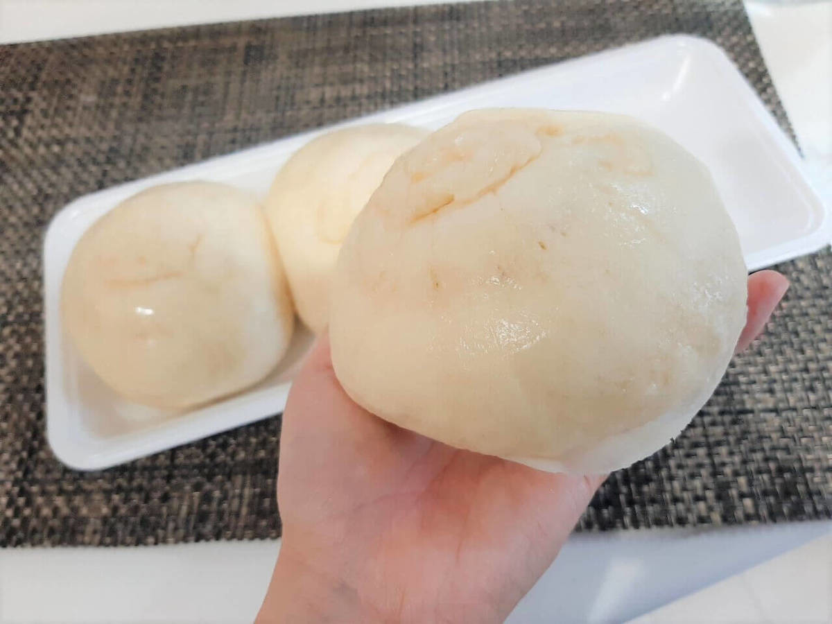 ふっくら大きい肉まんができあがりました。 温めたては熱々なのでやけどに気を付けてくださいね。