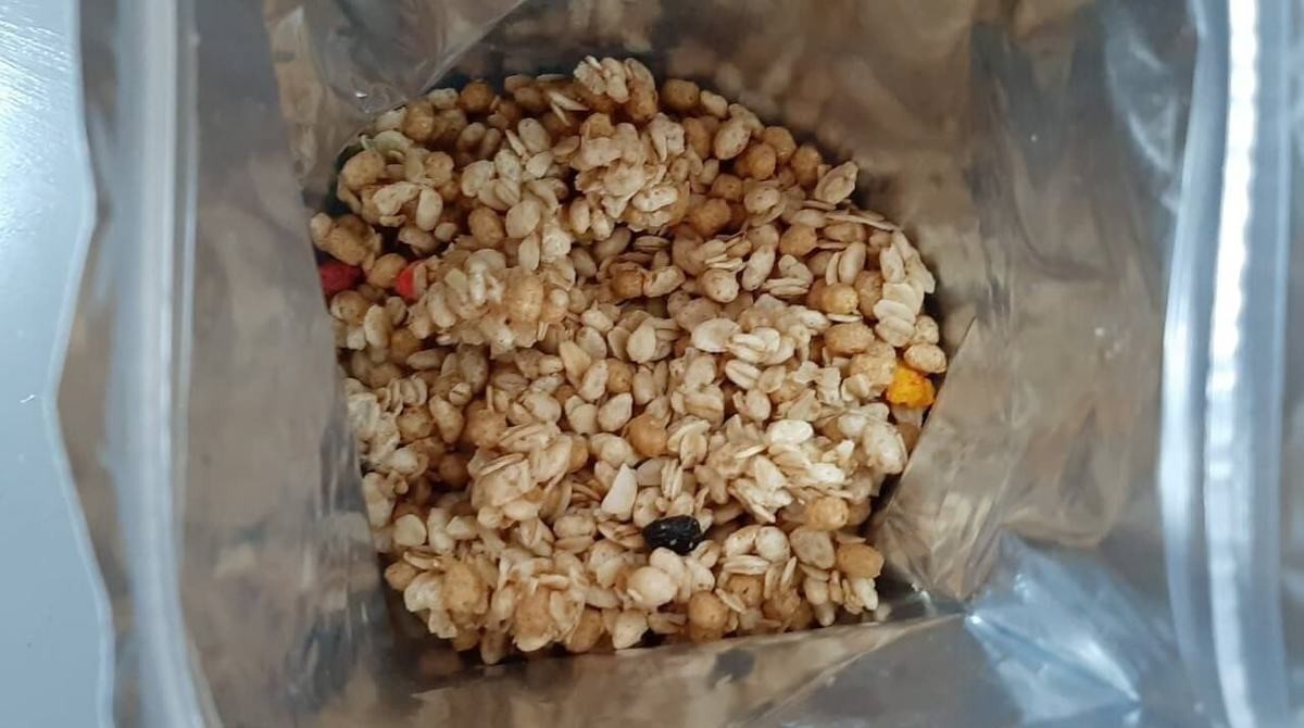 袋の中を覗いてみると、シリアルの中にフルーツが見えます。 甘い香りがとっても美味しそう♪