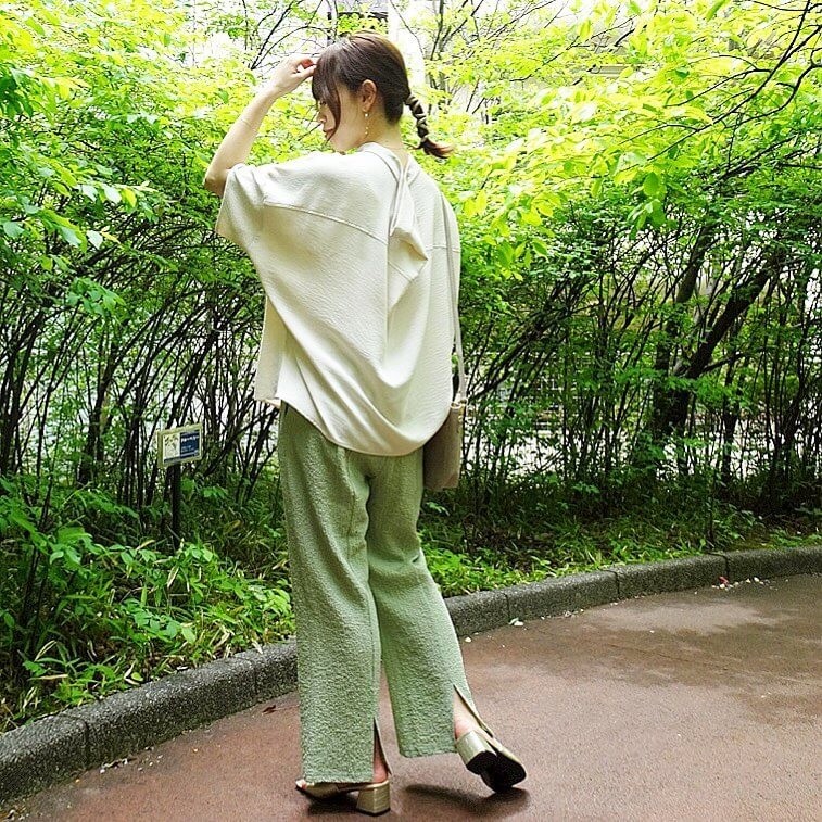 アイボリーブラウスにグリーンパンツを組み合わせた、爽やかな配色コーデ。