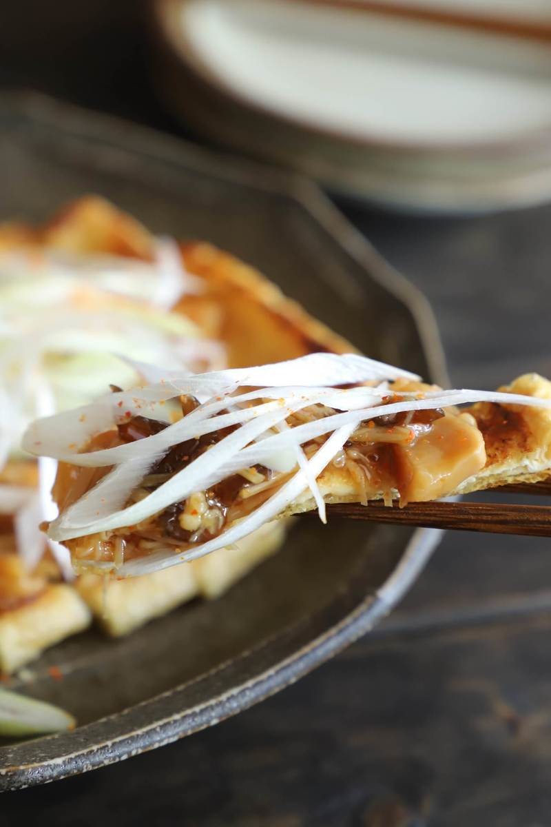 - 油揚げは油を引かないフライパンで押し付けるようにして焦げ目がつくまで、しっかりと焼く。