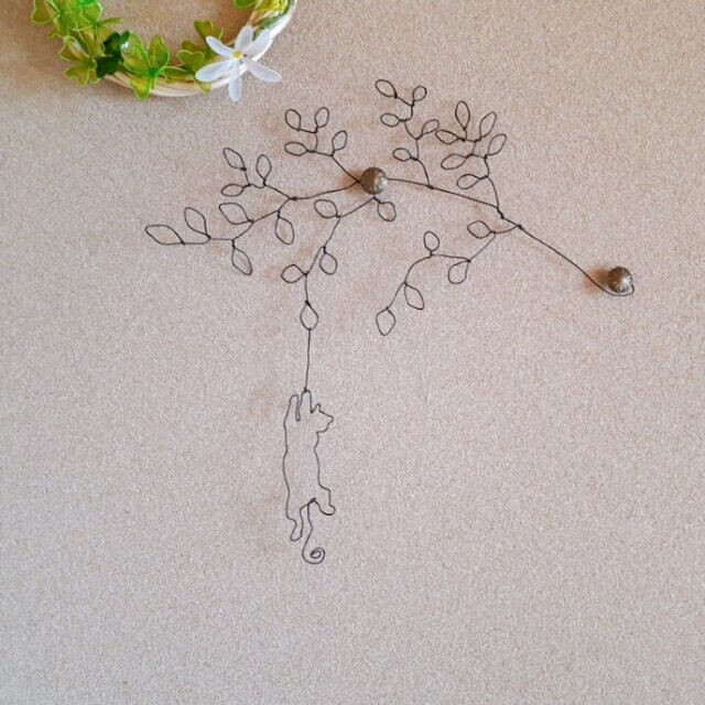 猫ちゃんが葉っぱにぶら下がっている様子を表現した、とってもキュートな作品「猫のワイヤークラフト」です。