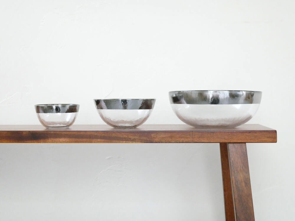 小さな金鎚で一つ一つ目を打ち付けていく。 そんな方法で生まれる凹凸のある鎚目模様は光が美しく反射し、見る人の目を惹き付けます。 まるで“月夜に揺らめく水面をすくい取ったかの様な”キラキラした幻想的な景色が想像できますね。