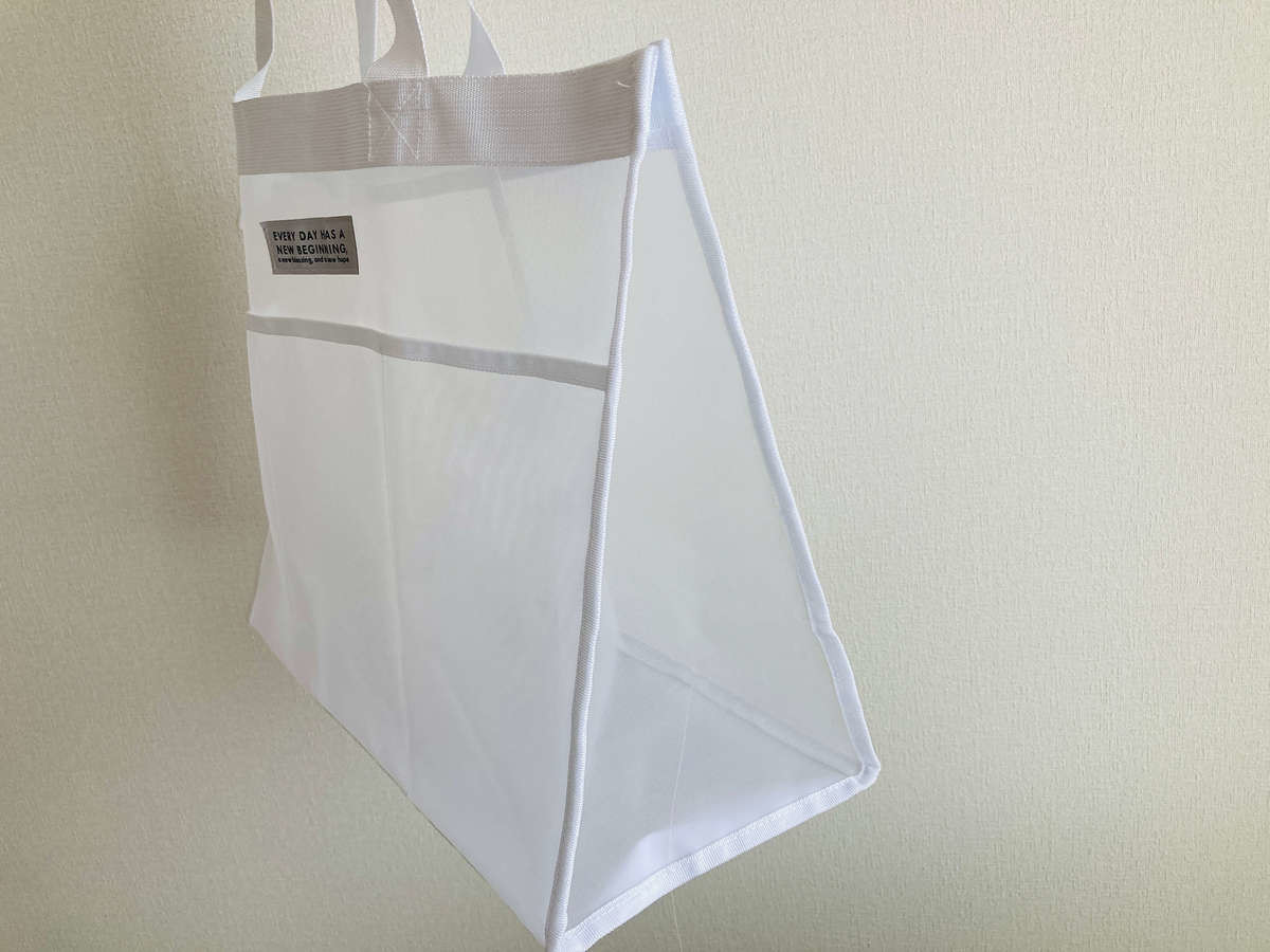 大容量メッシュバッグは斜めがけができるタイプですが、こちらは肩掛けタイプ。さらにサイドにパイピング加工がされていて、しっかりとした四角いデザインが特徴です。