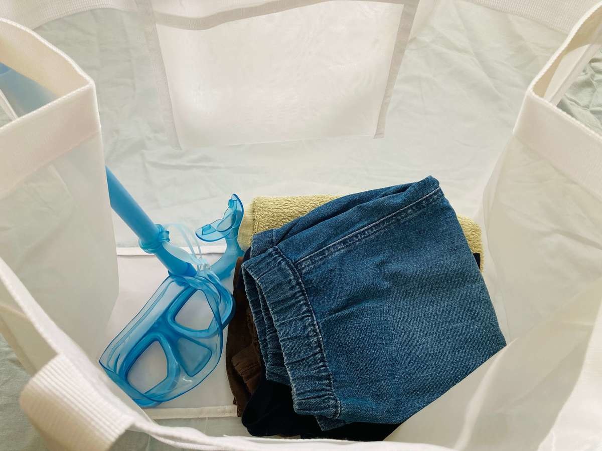 試しに子ども用のシュノーケルセットと水着やタオル・着替えを入れてみました。入った量は全体の3分の1程度。まだまだ倍以上は入ります!