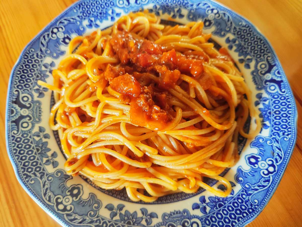 お肉なしでも具がたっぷり入っているので満足感があり、パスタにソースがよく絡んでおいしいですよ。