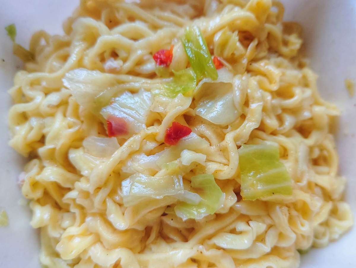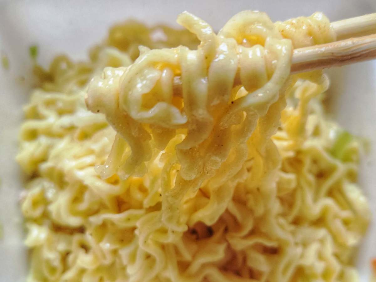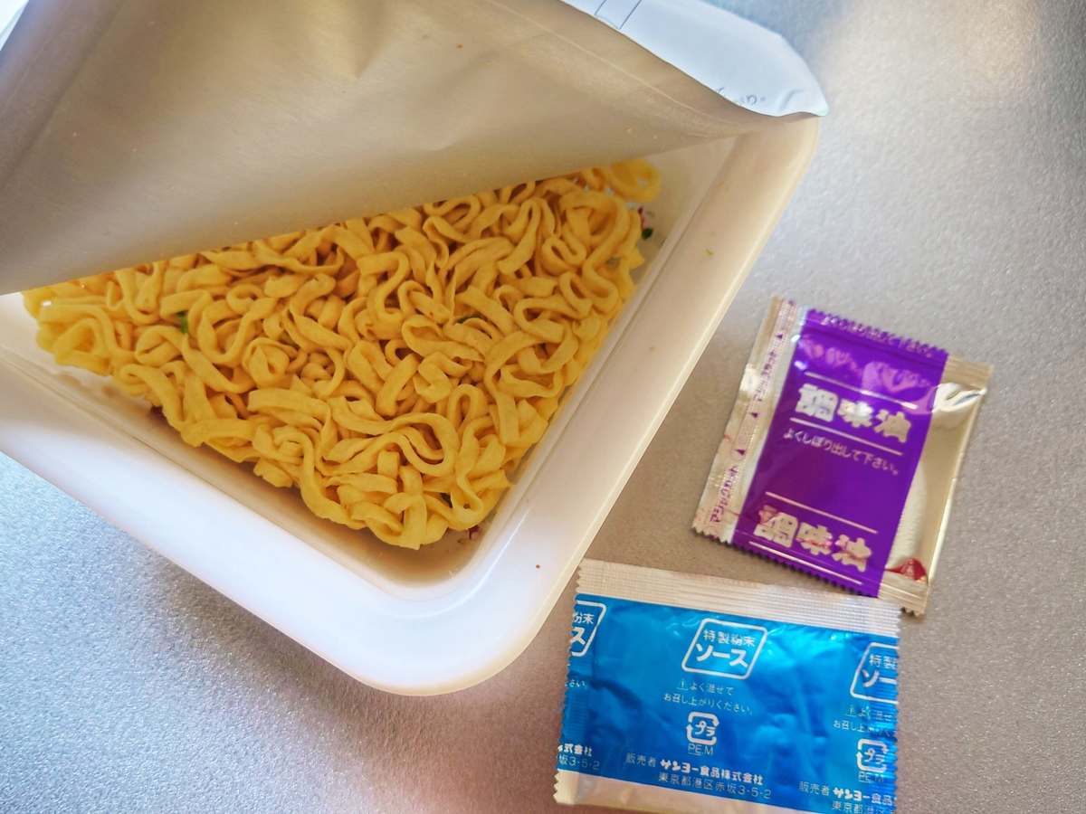 湯切り口からお湯を捨ててフタを剥がし、調味料2袋を入れて混ぜれば完成です。