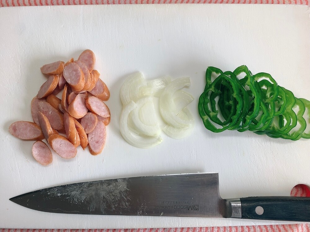 玉ねぎは縦に薄切りにして、ピーマンは種を取り除き、5mm幅程度の輪切りにして、ウインナーは斜め薄切りにします。