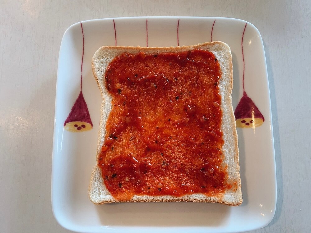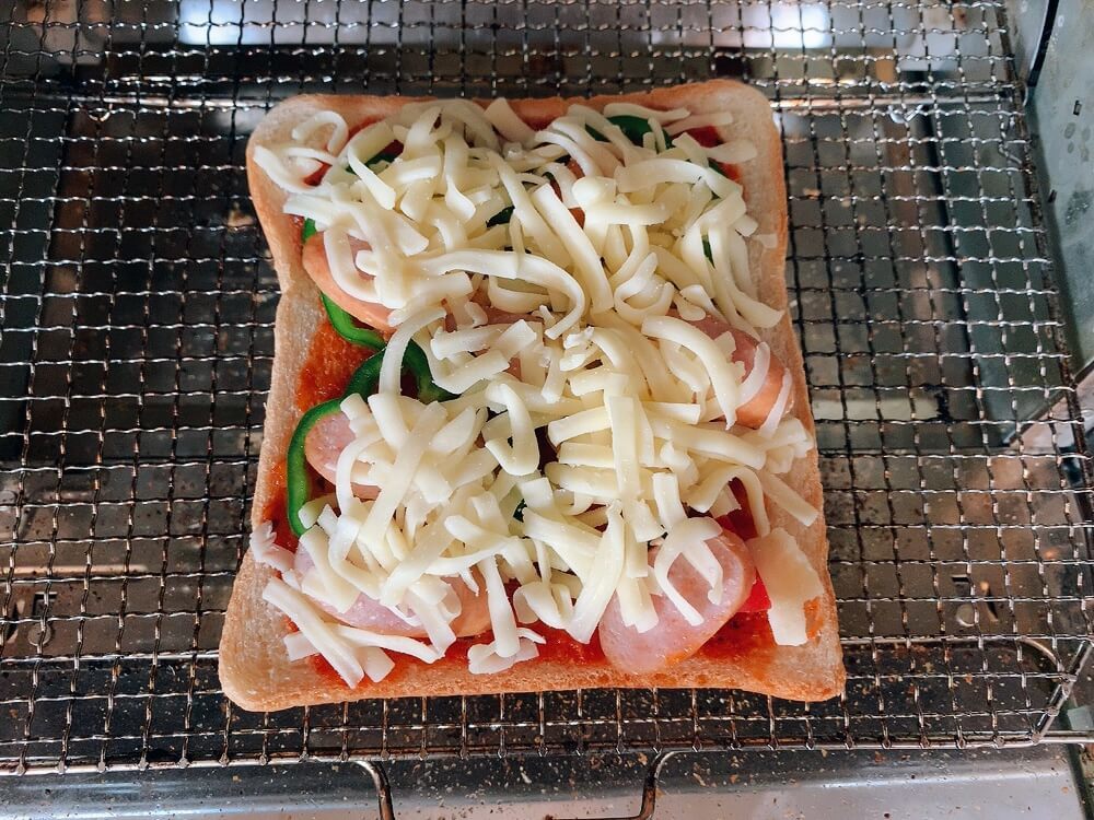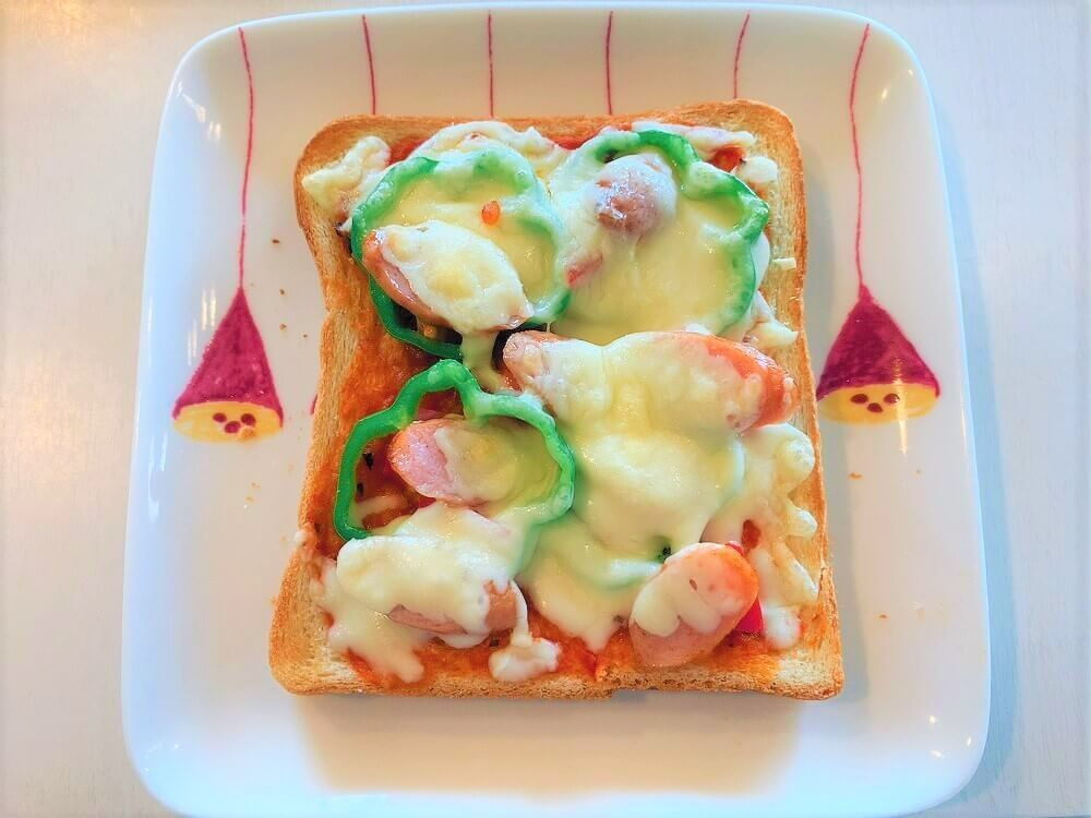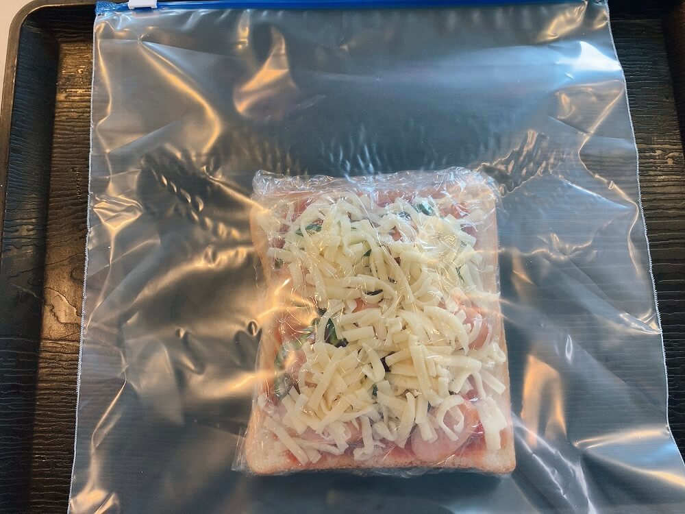 ピザソースが食パンによく馴染み、モッチモチ。冷凍してから焼くことで、チーズがよく焼けてちょうどよい伸び具合でした。