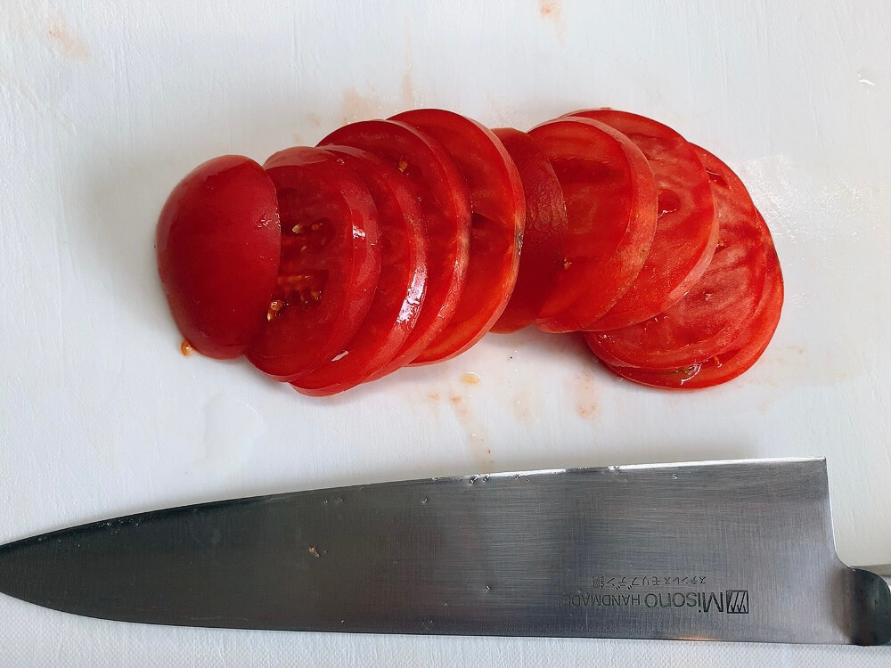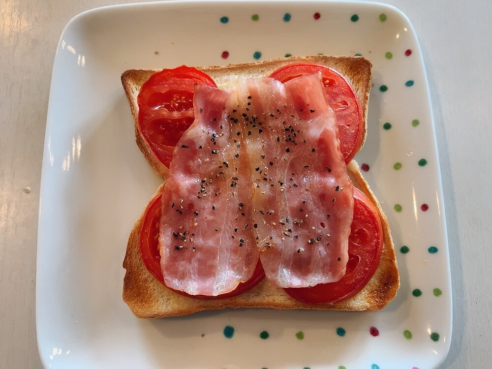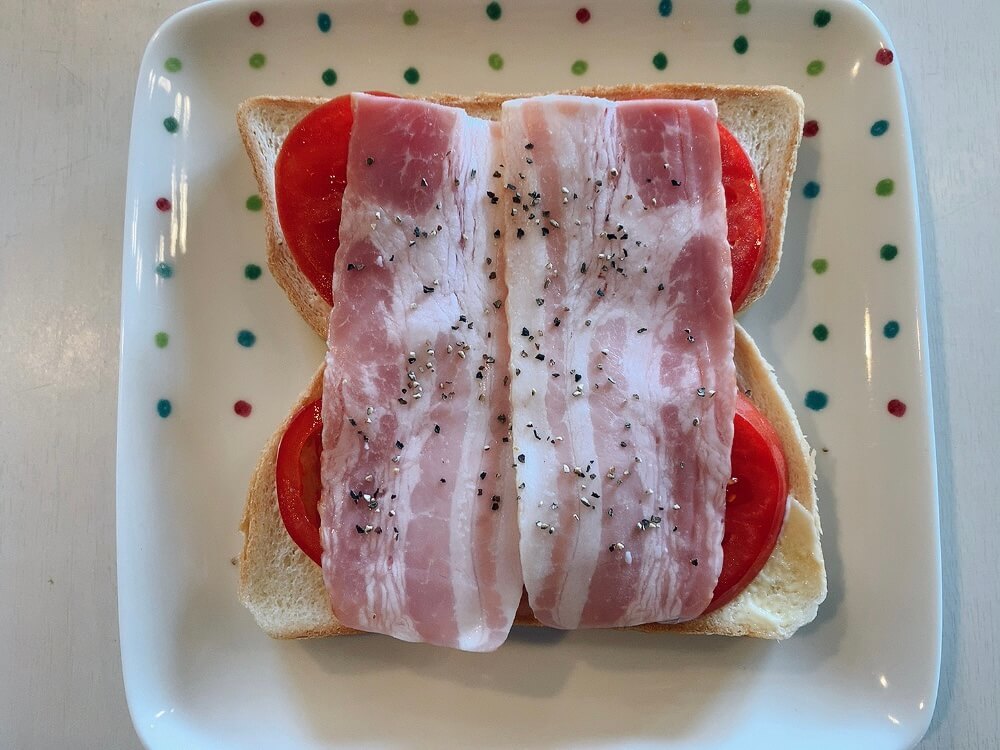 食パンにトマトとハーフベーコンをのせて、黒こしょうをふっておきます。