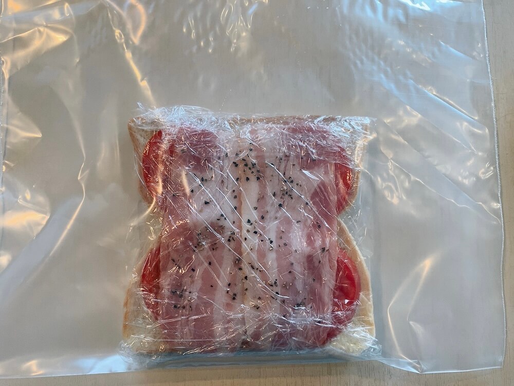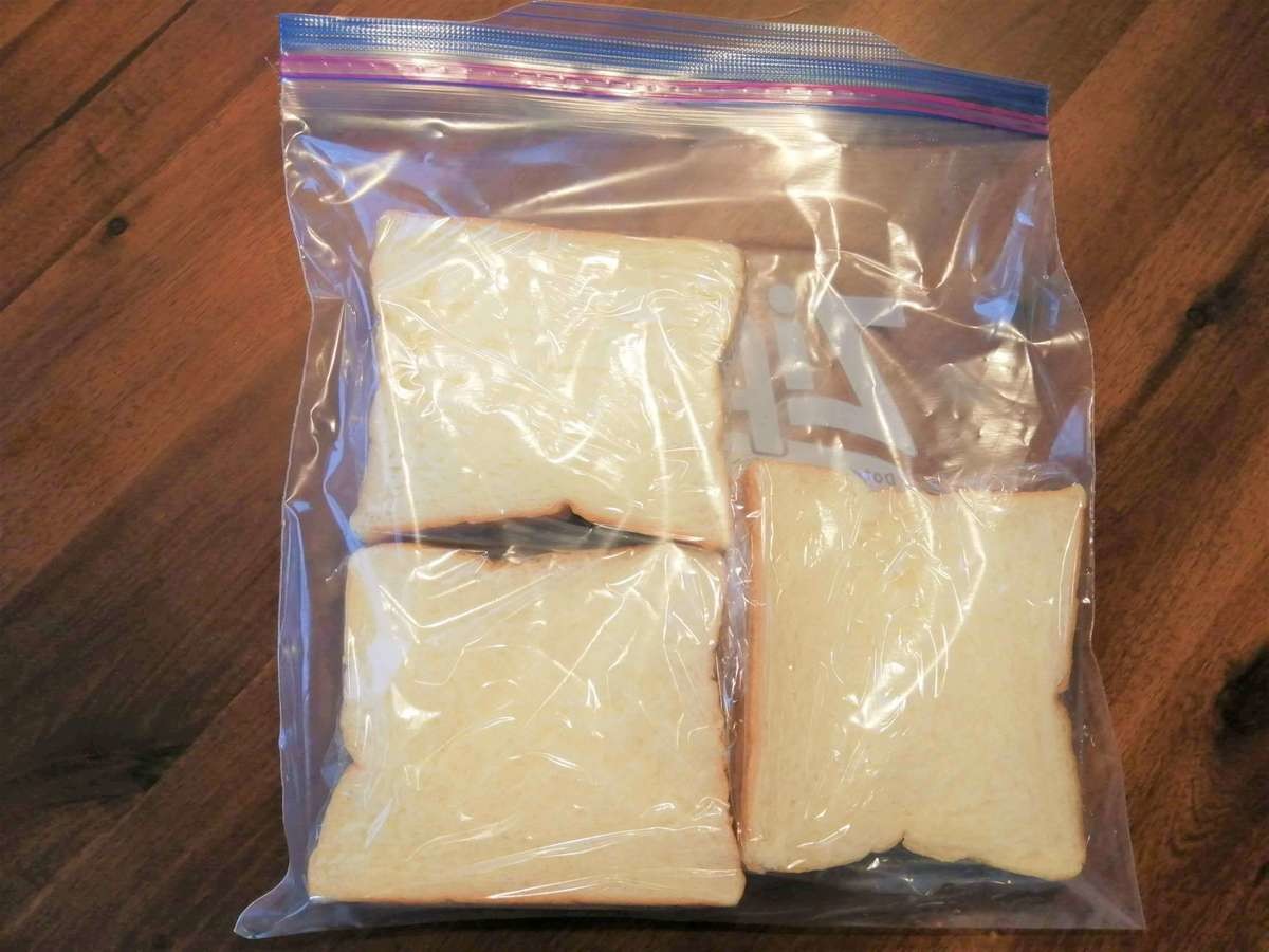 食パンを1枚ずつ、ラップを使って丁寧に包みます。それを、密閉式保存袋に入れて、空気を抜きながら閉めます。