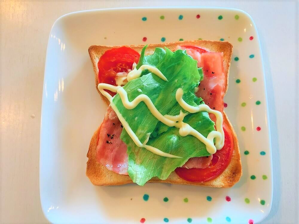 パンに焼き色がつくまで焼いたらレタスをちぎってのせ、マヨネーズを細く絞ってかけて完成!