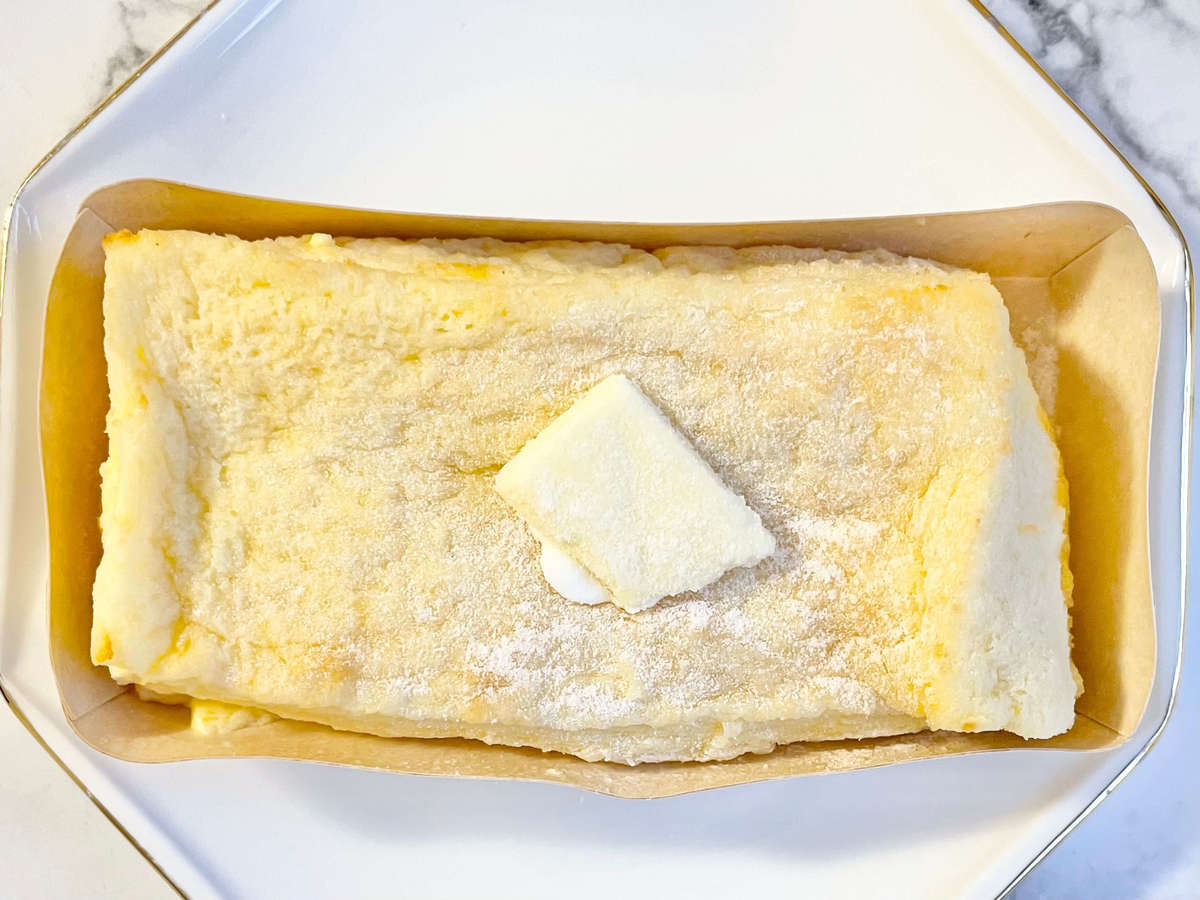 厚切り食パンをこだわりのフレンチ液に長時間漬け込み、表面はふんわり中はとろりと焼き上げた商品。ひとかけのバターがトッピングされています。