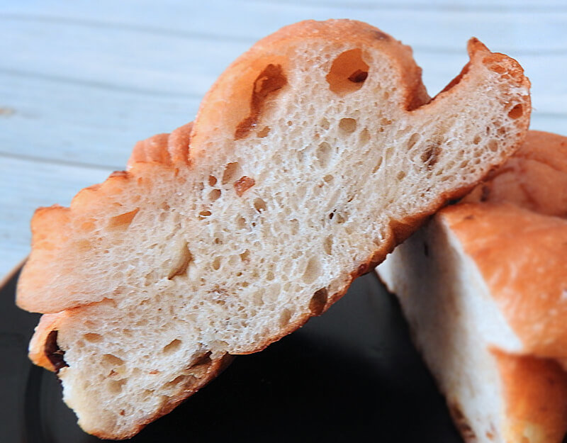 小麦粉の甘みと共に、チーズの香りとチーズが焦げたような苦みがありました。私や夫はチーズが一番気に入りましたね。もし、生ハムや生野菜があれば、上へのせたりはさんだりして食べてもよさそう!