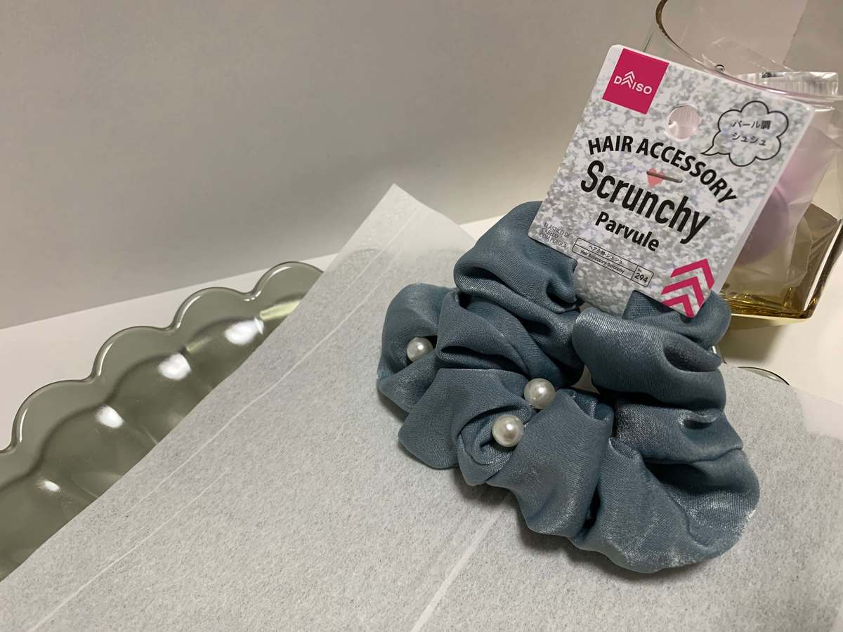 店頭でも上品さが一際目立っていた“パール付きシュシュ(税込110円)”。私が購入したのは大人カラーのグレーです。