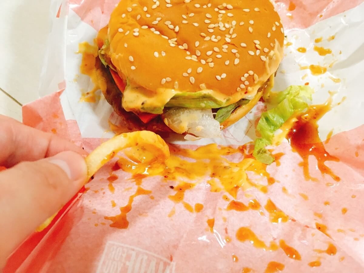 バーガーからはみでた七味マヨソースを、ポテトにつけていただきます♡