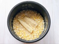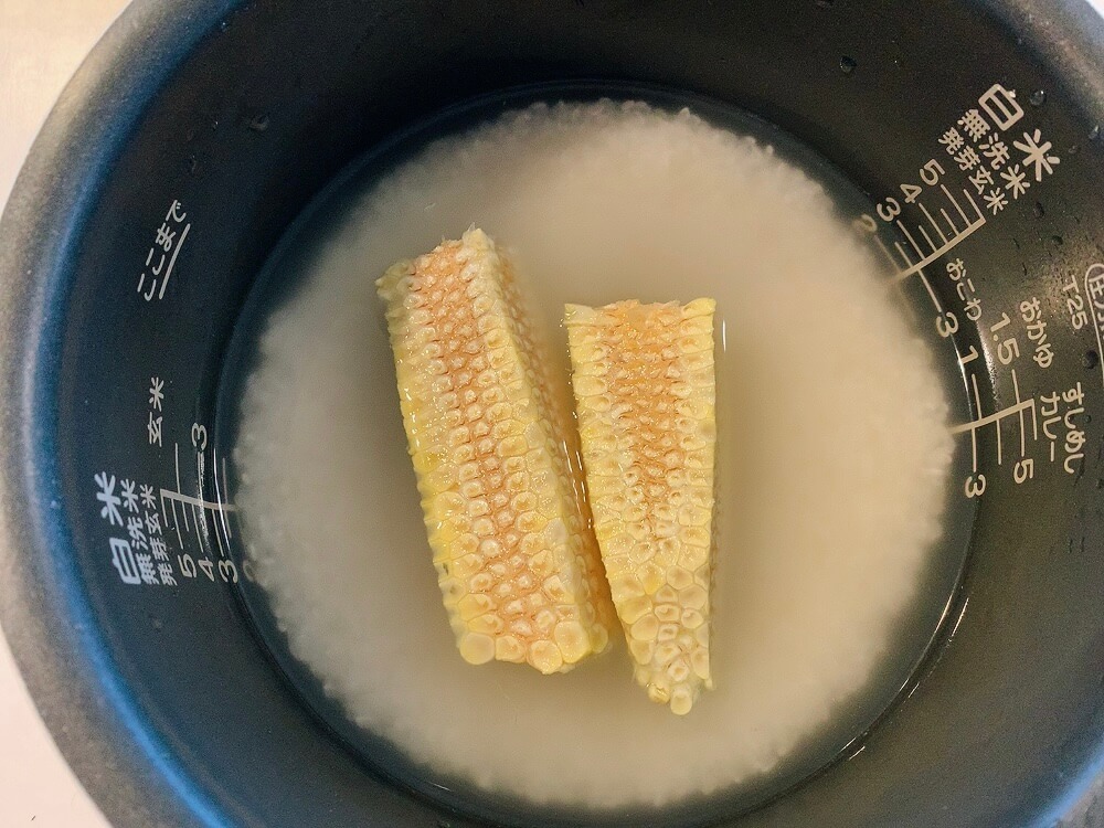 作り方②炊飯器にお米+とうもろこしの芯を入れて炊く