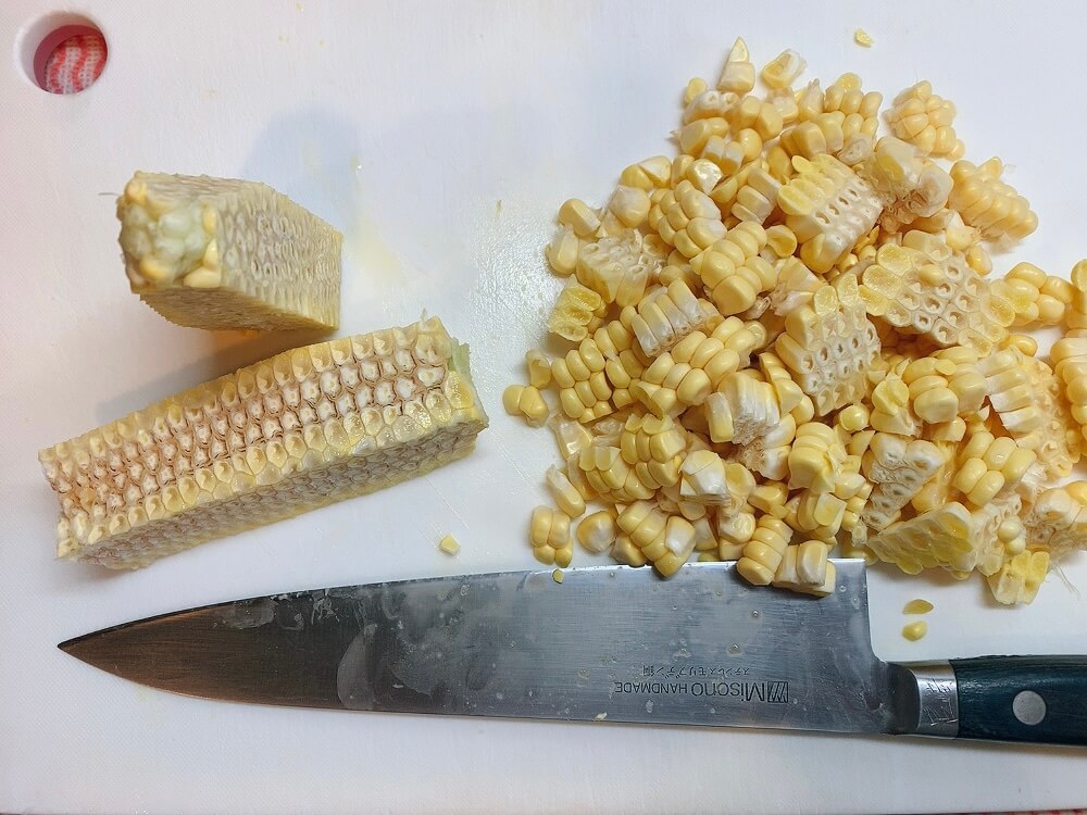 作り方①とうもろこしを半分に切り、実をこそぎ取る