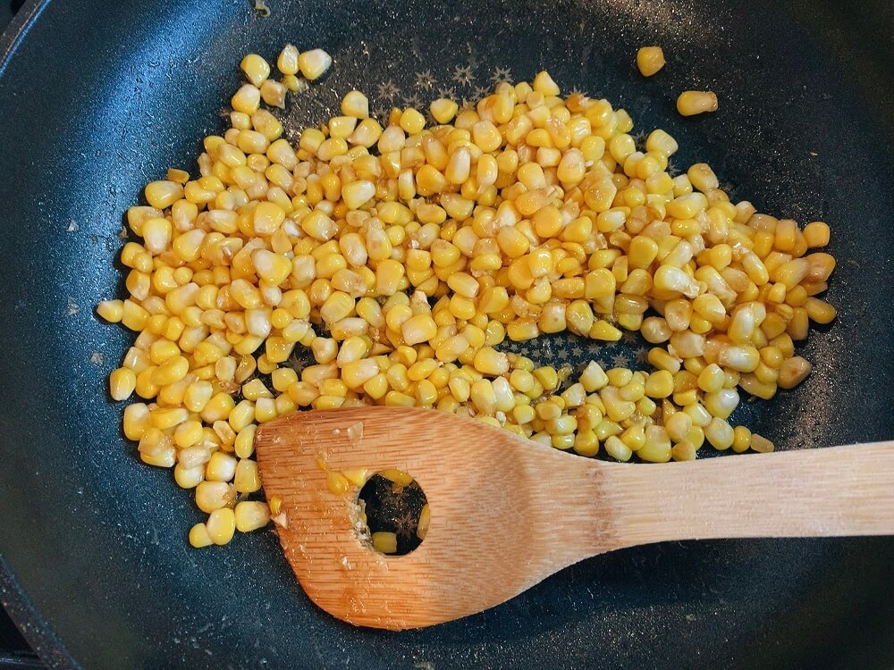 お米を炊飯している間、熱したフライパンにバターを溶かし、とうもろこしの実を加えて炒めましょう。